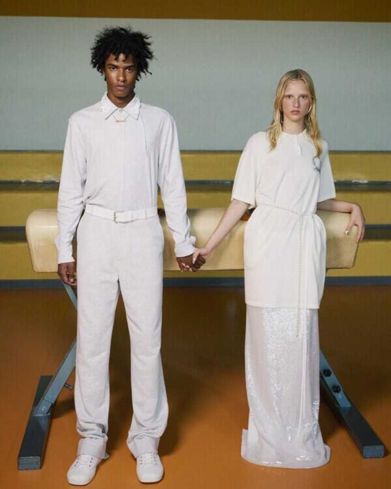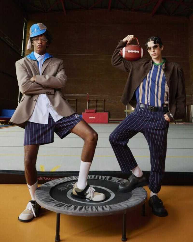 紧接着的健身房场景更是反转不断。一位 MOSCHINO 女孩身披外套潇洒现身普拉提教室,手中的Tie Me包袋幽默而别致。一对情侣以仿真的雕塑印花套装与透明经典装扮亮相,巧妙融合了运动风与玩味趣味。此外,夏日泡泡布西装与马海毛网眼网球毛衣搭配同款健身包,进一步模糊运动与正式着装之间的界限。