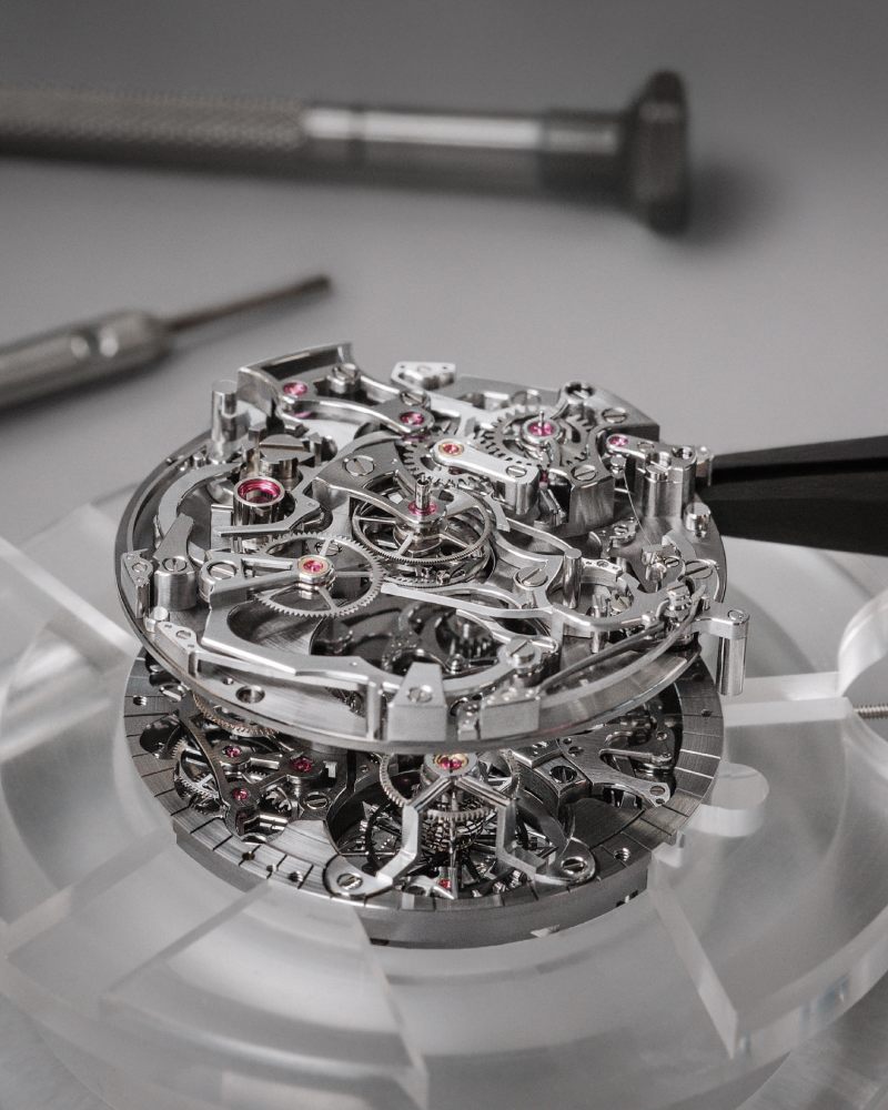 Les Cabinotiers Temporis Duo Grand Complication Openface 腕表内置最新 Calibre 2757 S 机芯,共 696 个零件,兼容卓越性能与精妙构造,厚度仅 10.4mm,直径33.3mm。机芯采用精细化布局,特别设计的双追针计时板搭载创新材料,采用钛合金与镍磷电铸齿轮,以实现更流畅、更精准的齿轮啮合。