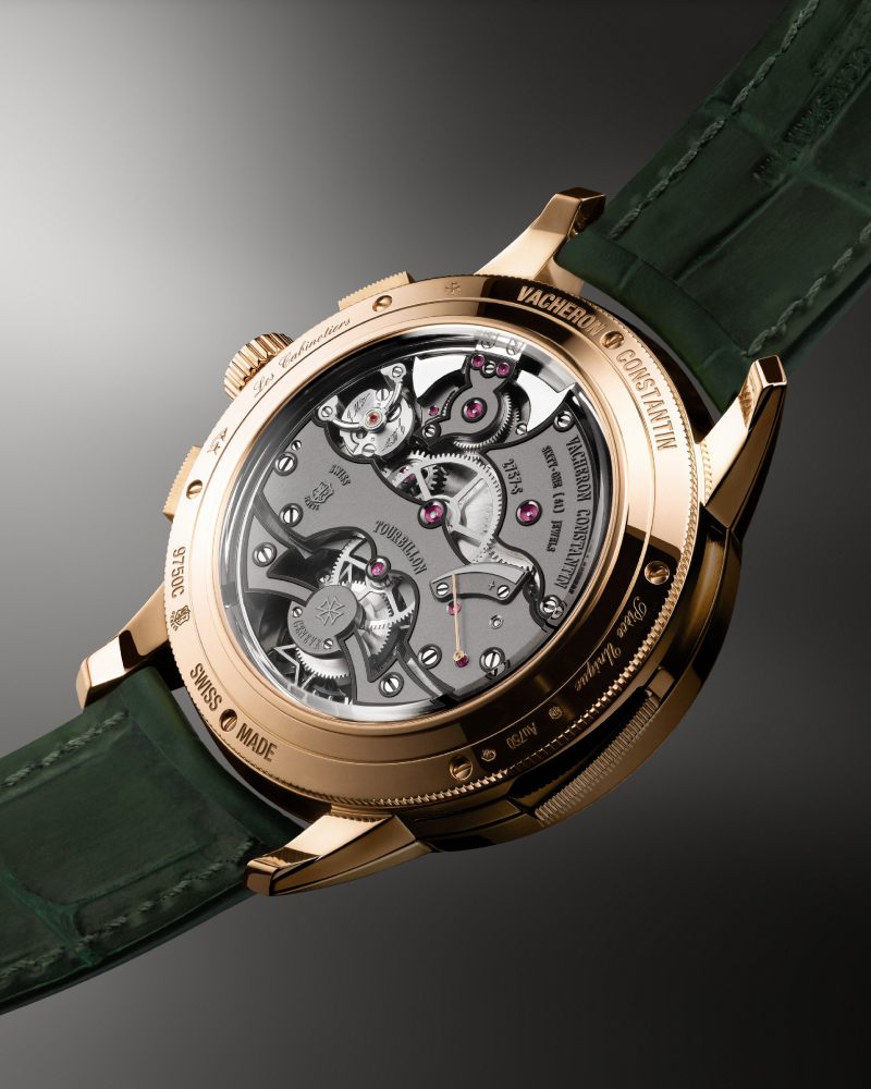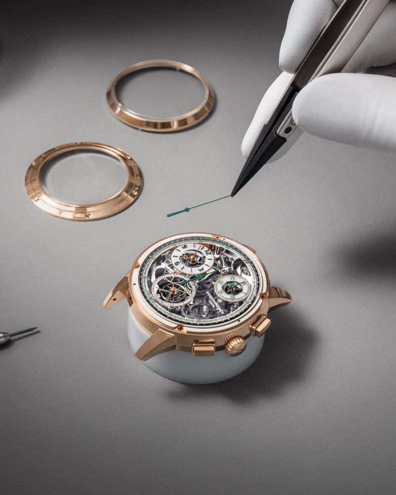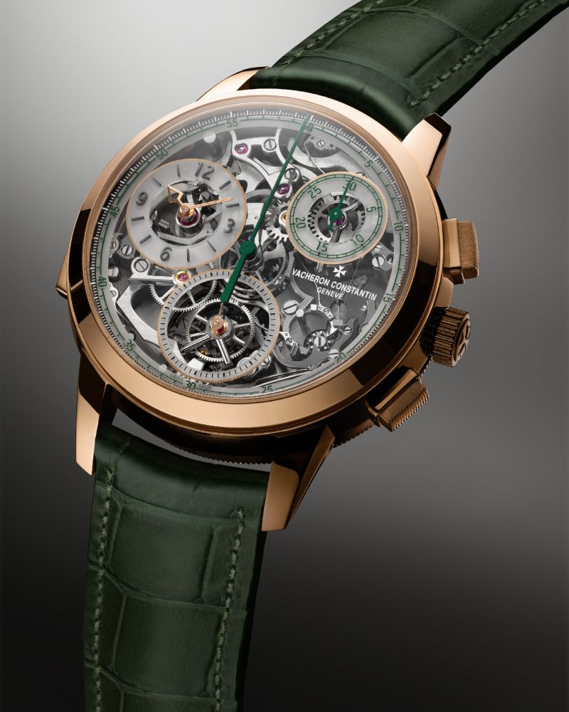 两根计时秒针与 30 分钟计时针均采用橄榄绿 PVD 涂层铝材质,与同色系的绿色鳄鱼皮表带相呼应。腕表表壳采用 45mm 5N 粉红金(750/1000),通过透明蓝宝石底盖,机芯的精致手工润饰一览无遗。