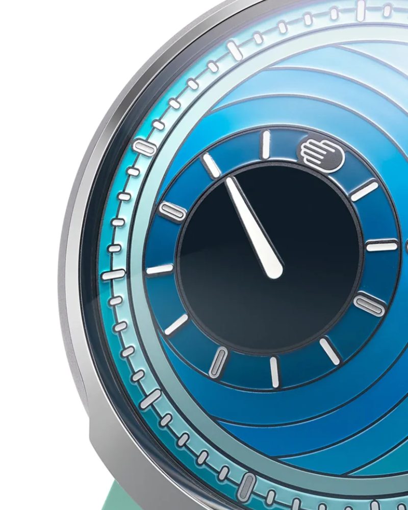 Ressence 与艺术家的跨界早已不是新闻,但这次找来德国雕塑画家 Daniel Engelberg,可谓惺惺相惜。以其代表作《Inside Out》为灵感,结合 Ressence 标志性的油封时间显示,TYPE 8 DE1 和 DE2 把几何的层叠感与油封液体的折射玩到极致:表盘犹如一颗内卷的同心圆,指针与小时盘似乎悬浮其中,顺着雕塑般的色彩流动而转动,构成独一无二的动感错视。