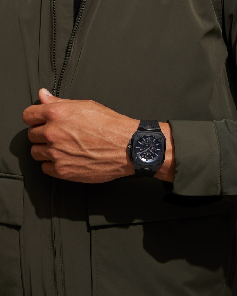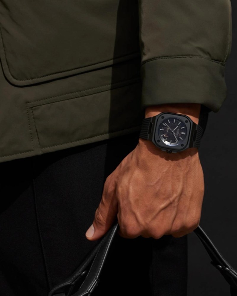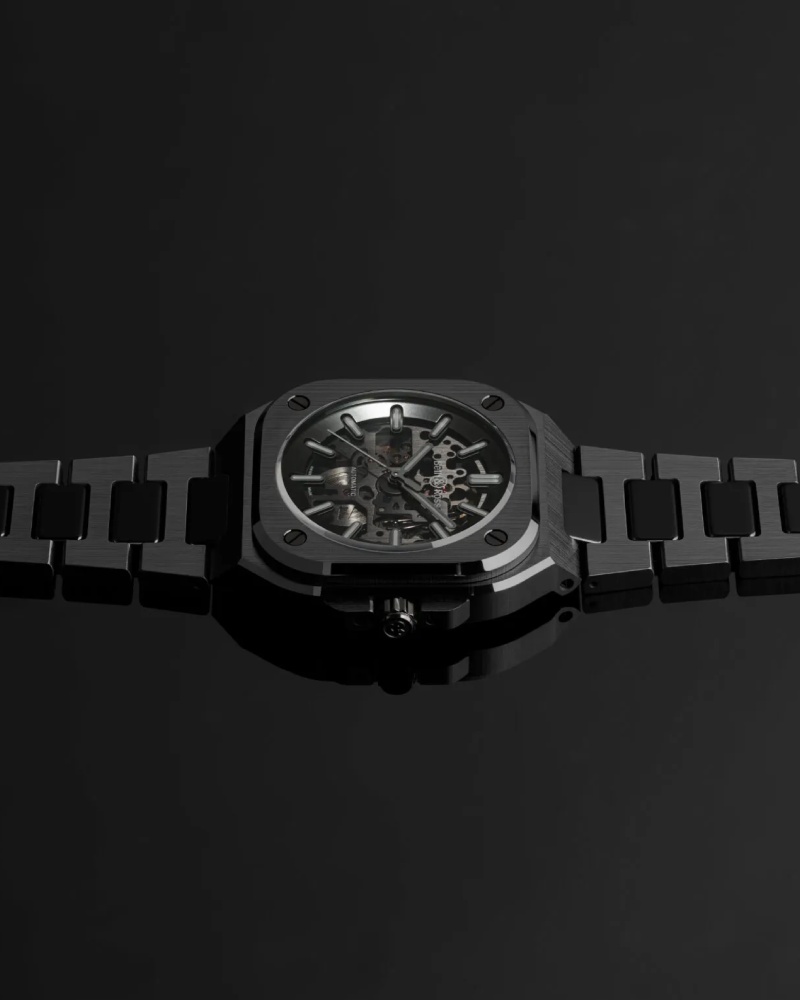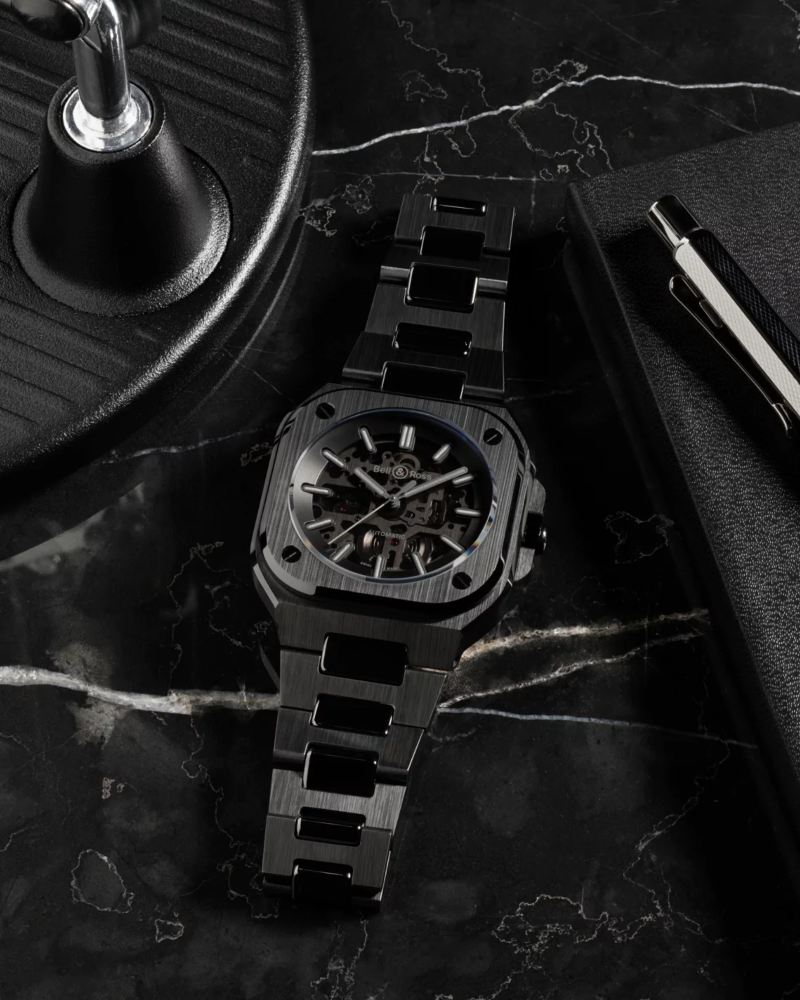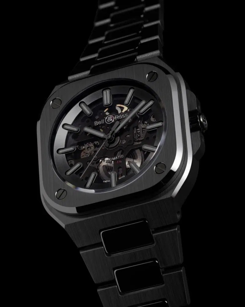 \这款腕表保留了 BR-05 经典的 “方中带圆” 造型,其方形表壳与圆形表盘交错出独特张力。表壳与表链一气呵成,采用高强度黑色陶瓷材质,并施以哑光与抛光交错处理,质感细腻中又不失力量感。Bell & Ross 联合创办人暨创意总监 Bruno Belamich 表示,这一设计既承袭了航空仪表盘的清晰可读性,也致敬了 1970 年代盛行的一体成型表壳风格,而这次以全黑形式演绎,更加深了腕表的视觉冲击与神秘气质。