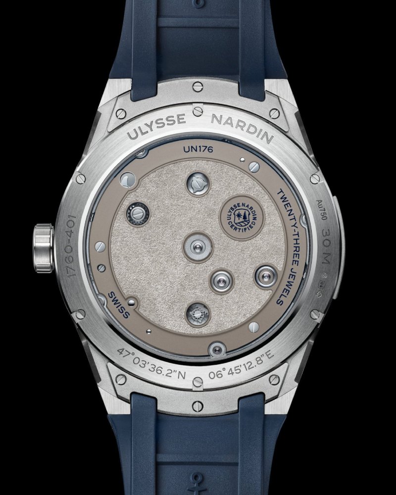 BLAST 自由之轮搭载的 UN-176 自制机芯,以飞行式双发条盒系统与创新的雅典锚式恒定动力擒纵结构为核心,创造出仿佛悬浮于空中的视觉奇观。其中巧妙的动力储存显示,采用旋转式设计,让腕表呈现出更具互动性的观赏效果。搭配蓝色天鹅绒质感防水橡胶表带与白金折叠扣,更为腕表增添一份尊贵与舒适感。