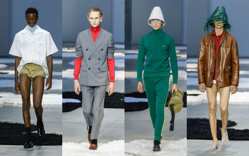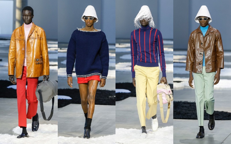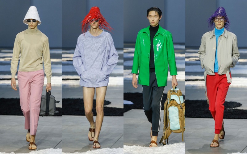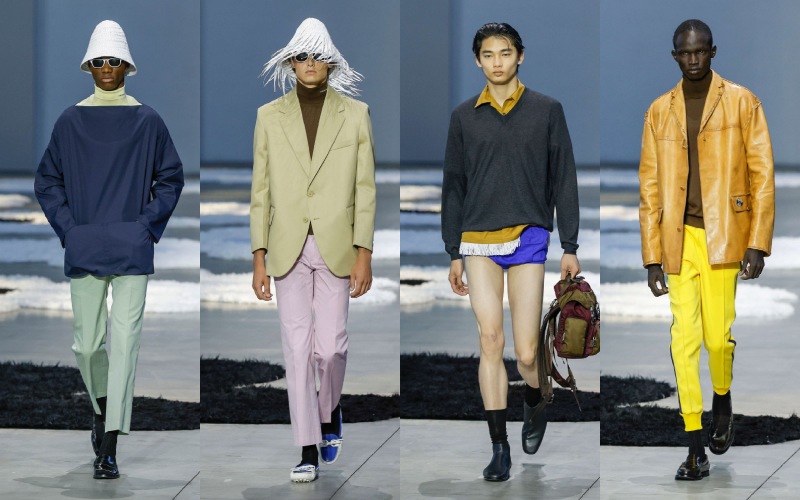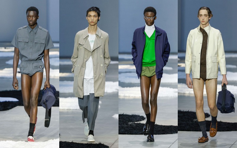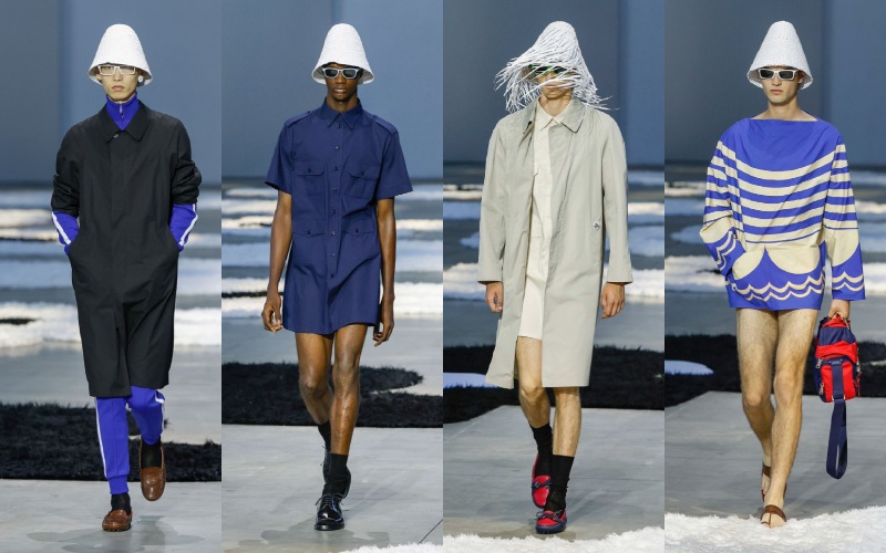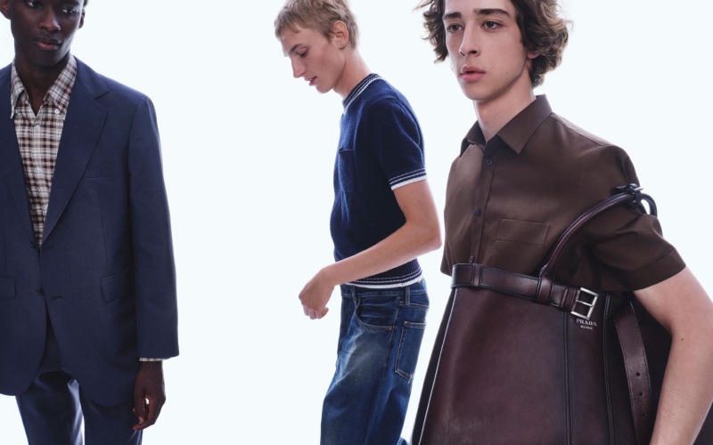 尼龙包、果冻质感的人字拖、翻红的经典乐福鞋与斗笠轮廓的帽子,共同形成一种 “反装饰” 的装饰感,介于功能与幻想之间。尤其是那些从女装系列 “借来” 的短袖衬衫裙、圆领针织上衣,一方面延续了 Prada 一贯的中性语汇,另一方面也在暗示一种 “女性凝视” 下的男性形象——理想化、甚至带着脱离现实的诗意。