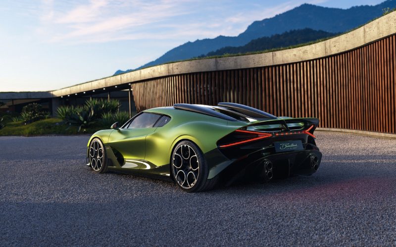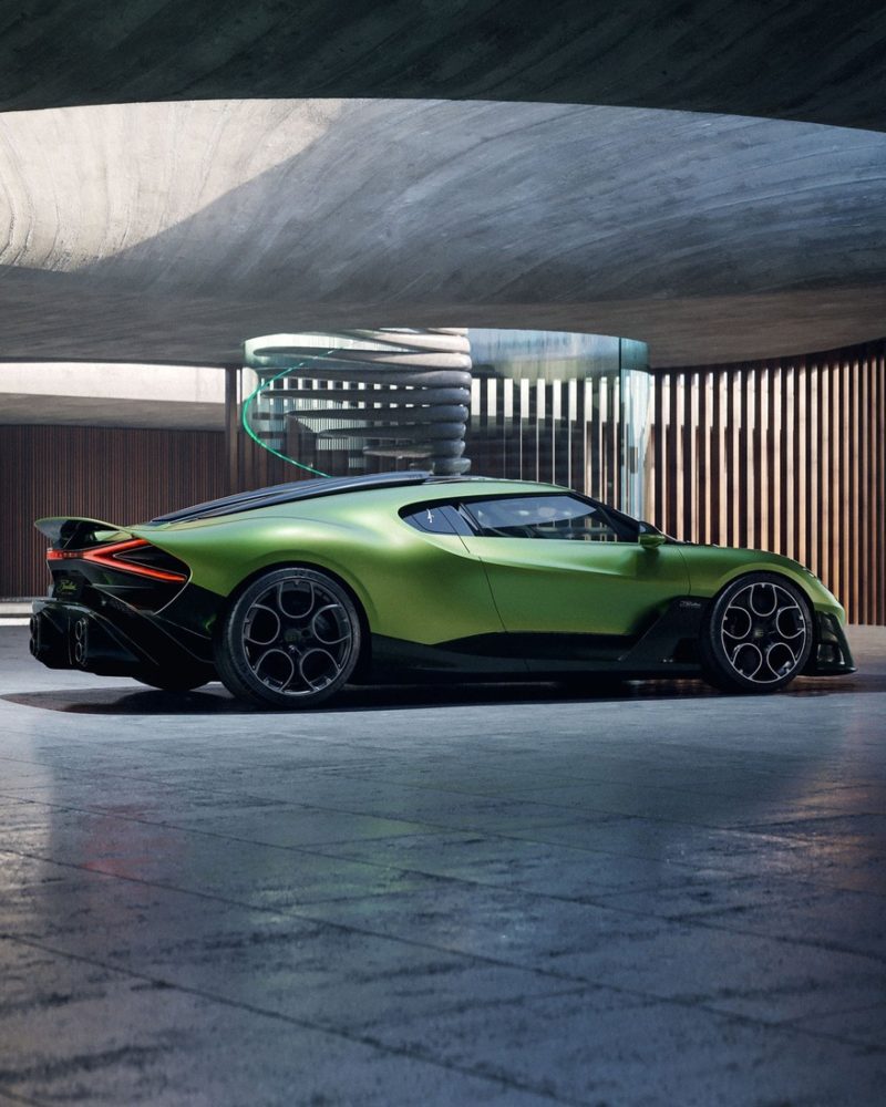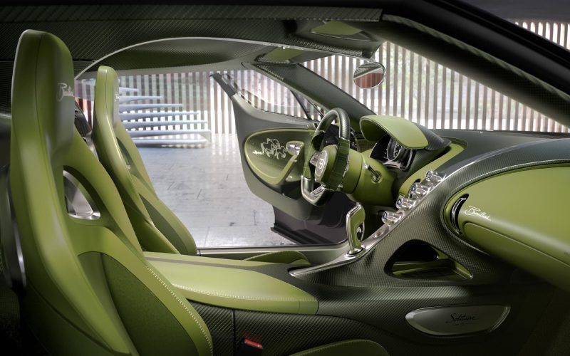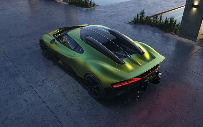 虽与 Mistral 同源,Brouillard 依然以独特符号彰显身份:固定式 “鸭尾” 扰流板在高速中稳如骑士控缰,座舱后的双进气口致敬早期 Veyron 的经典布局,绿色碳纤维车身以深邃层次展现材质之美、辨识度一眼即识,而全景玻璃车顶则引入充盈光线,营造出如 “现代大教堂” 般的通透与敬畏。