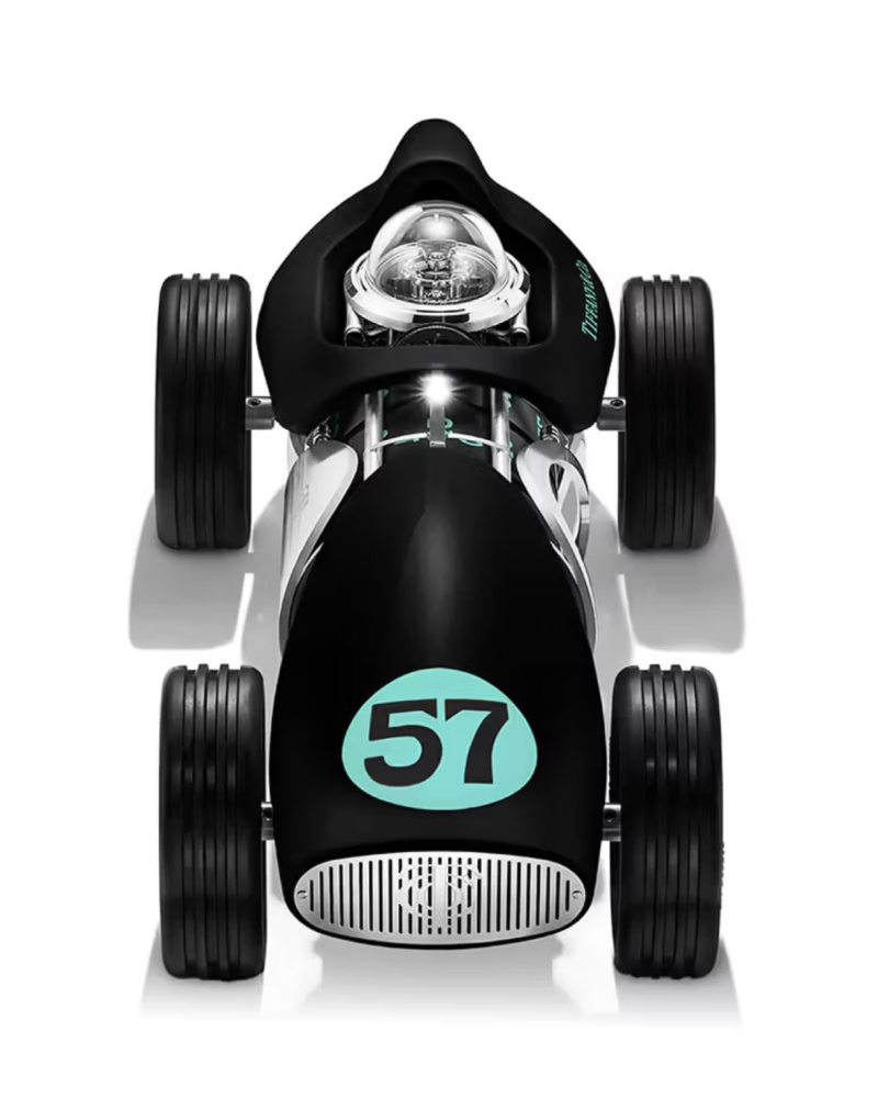 第一件作品「Time for Speed Clock」黑色版,是对赛车与钟表艺术的双重致敬。整件作品以大胆而深邃的亮黑色呈现,车身线条凌厉而充满速度感,细节中点缀着极具标志性的 Tiffany Blue®「57」字样,呼应纽约第五大道旗舰店的精神符号。动力核心来自瑞士制表名家 L’Epée 1839 手动上链机械机芯,拥有长达八日的动能储备。时间则通过车身侧面的旋转盘显示,创新且巧妙地诠释了 “速度中的时光”。这不仅是一座时钟,更像是一台凝固于当下的艺术赛车。