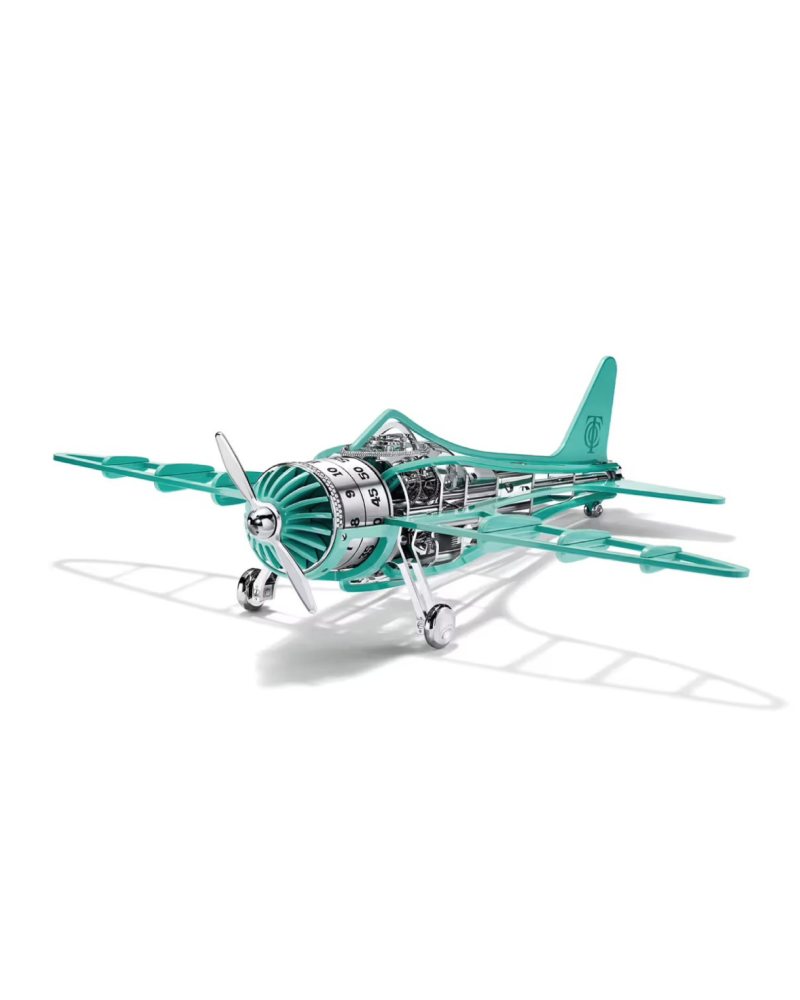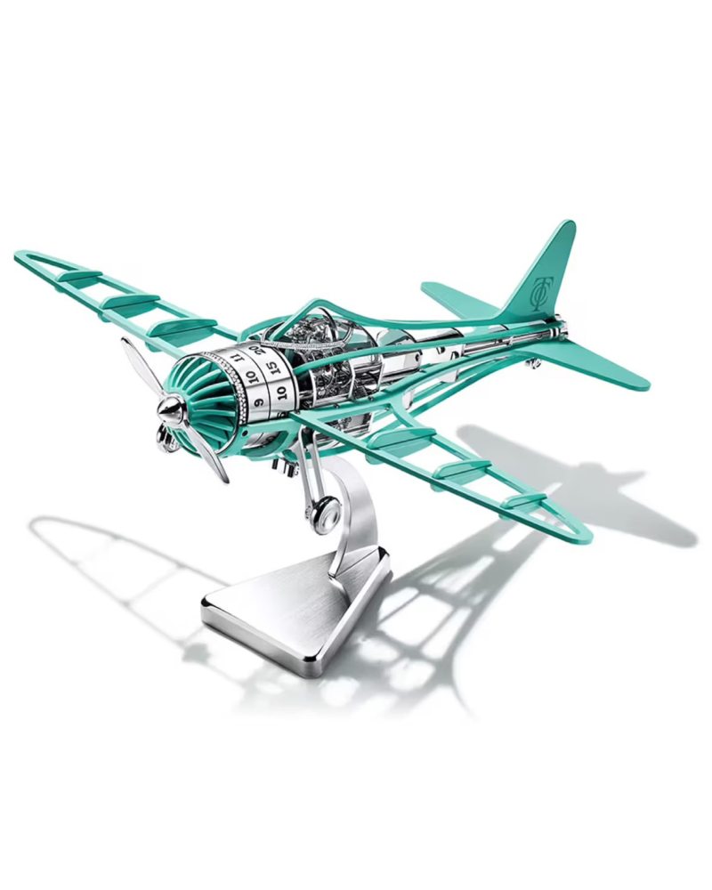 另一件作品「Tiffany Airways」钻石版,则以璀璨光辉将奢华推向全新高度。机身覆盖 511 颗总重 4.5 克拉的圆形明亮式切割钻石,闪耀于机首与驾驶舱,折射出 Tiffany 百年珠宝工艺的非凡光芒。时间同样以旋转盘的形式展现于机身,延续 Time Objects 系列的趣味与巧思。配合专属展示支架,这架 “时光之机” 仿佛随时准备起飞,将观赏者带入一场想象的旅程。机芯依然由 L’Epée 1839 提供,八日动力的持久能量,与钻石的永恒象征相呼应。