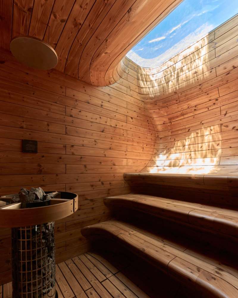 然而,Earth 的惊喜远不止于此。别墅底层隐藏着丰富的功能空间:由上方泳池透光的 “水下”桑拿房,既私密又充满未来感;健身房和儿童泳池为家庭提供活力与欢笑;而篝火庭院,则在夜晚点亮温暖氛围,带来与自然和人群共处的静谧时刻。每一个细节,都体现了设计师的巧思与居住者的舒适体验。