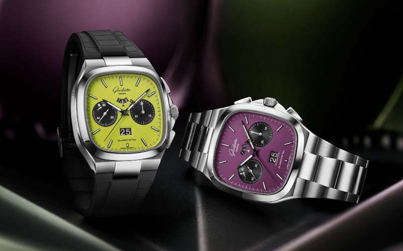 德系美学一向以严谨与低调著称,而 GLASHÜTTE ORIGINAL今年却将70年代的未来主义重新点亮。全新 Seventies Chronograph Panorama Date 限量特别版,以「Plasma」电浆紫与「Fusion」熔光绿两款前卫色调,仿佛从虚拟世界投射而来。方中见圆的 40x40mm 不锈钢表壳,经抛光与磨砂双重处理,在光线下折射出流动的层次感。