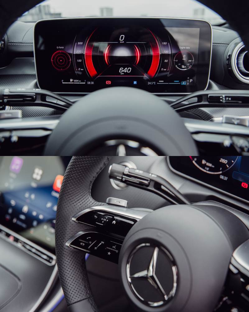 进入座舱,12.3 英寸全数码仪表与 11.9 英寸中控屏构建数字化驾驶氛围,ARTICO 人造皮与 MICROCUT 超纤维材质搭配红色缝线,营造 AMG 专属的动感格调。Burmester® 3D 环绕音响、氛围灯与平视显示器,更为驾驶注入豪华质感。无论驰骋赛道或日常出行,CLE 53 4MATIC+ 都是性能与舒适的完美交响。
