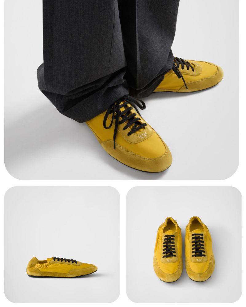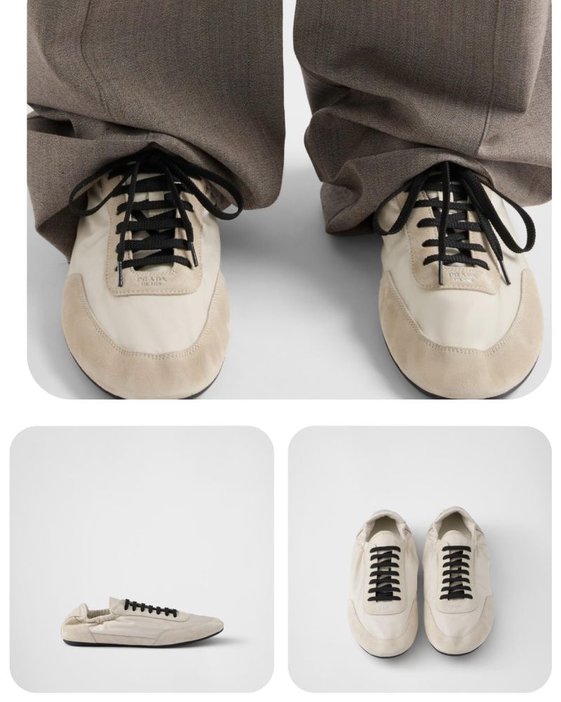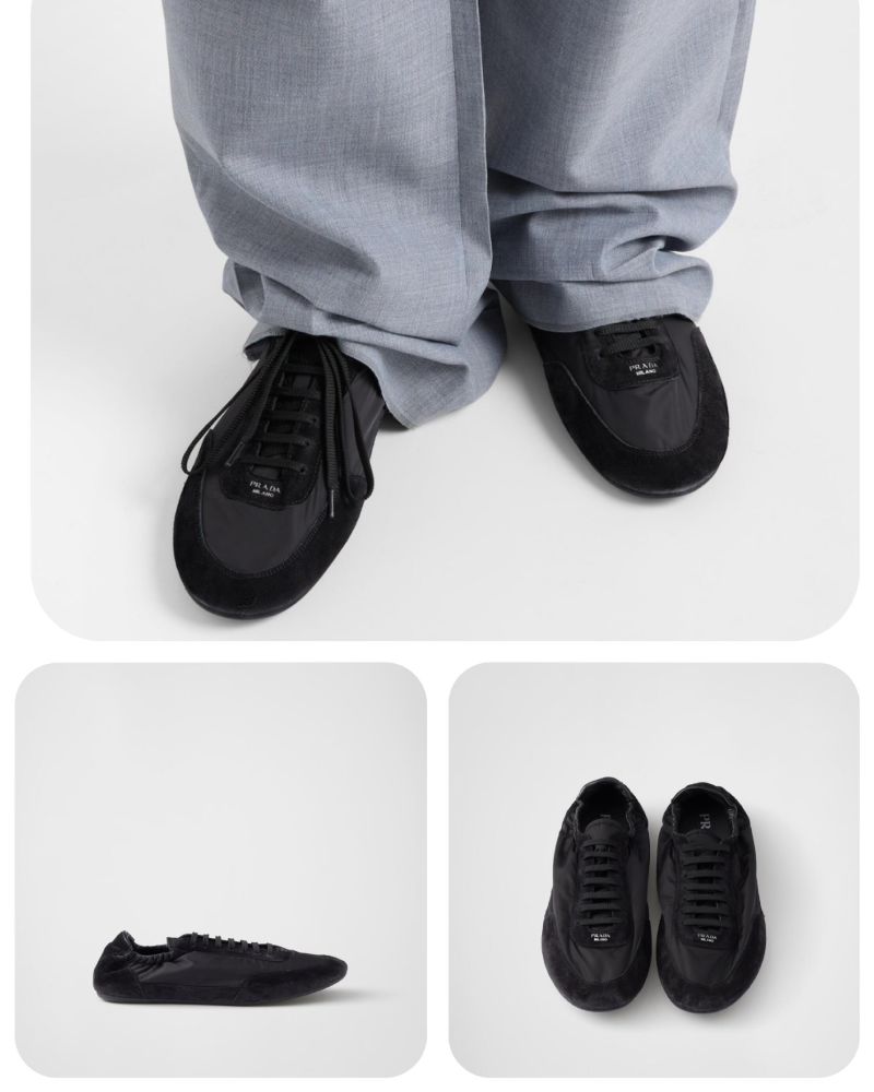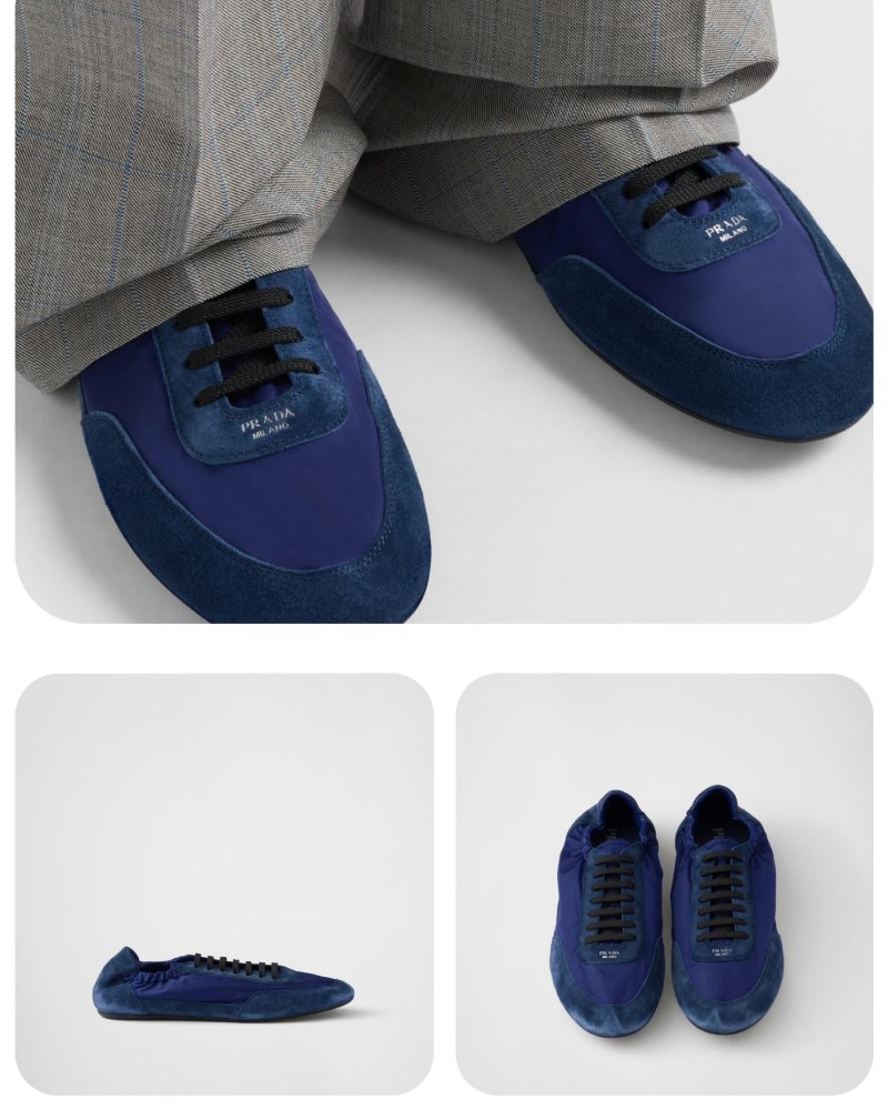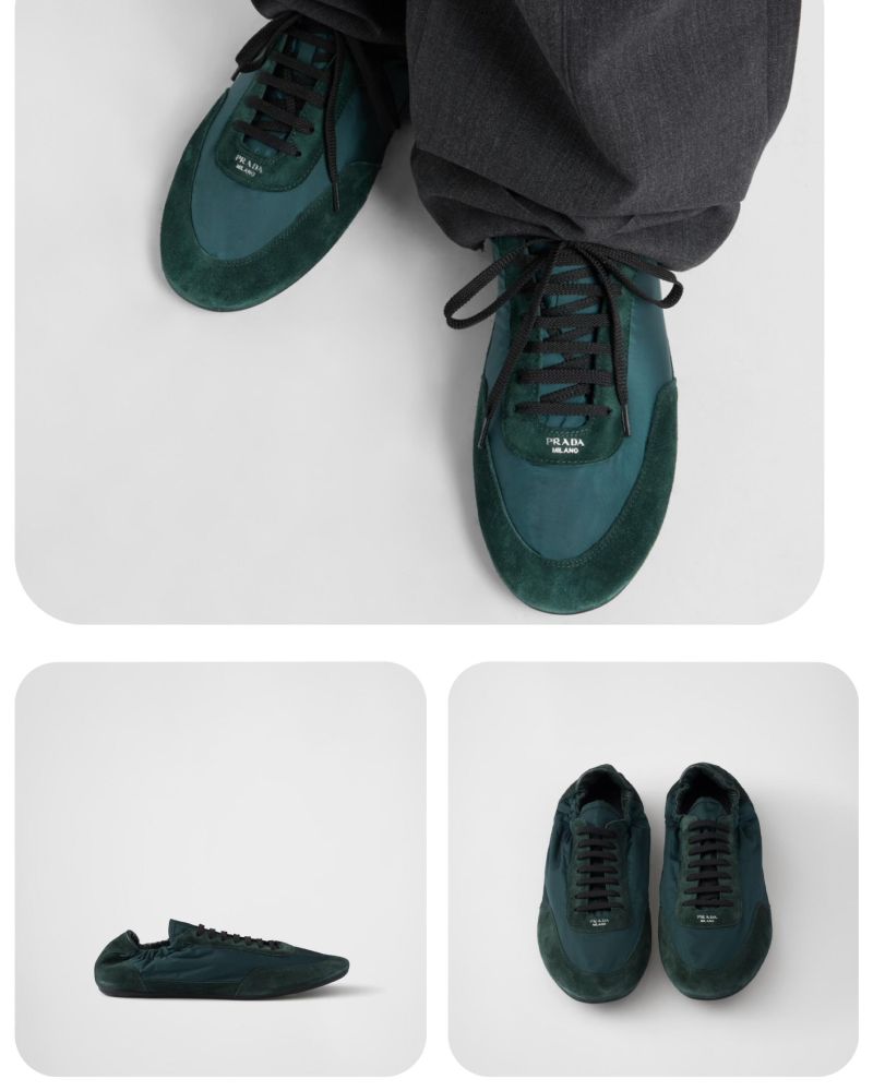 Prada 的 Collapse 系列,是对 “松弛感” 穿衣方式的一次非常 “Prada 式” 的回应。这双薄底运动鞋结合了 Re-Nylon 和绒面革,结构化但鞋面又带有可塌陷的软垂感,让它看起来不像传统硬挺的运动鞋,更像休闲易搭配的时尚单品。鞋口两侧的弹力收口设计,不仅方便穿脱,还增加了包裹感与舒适度。