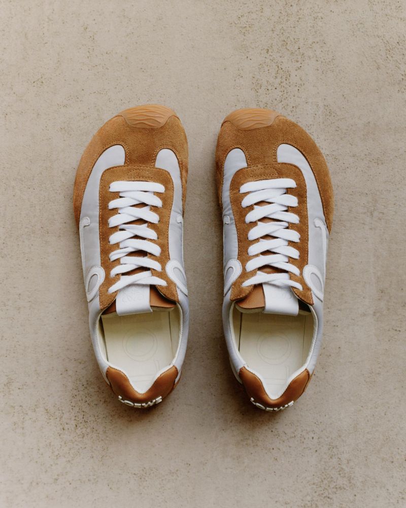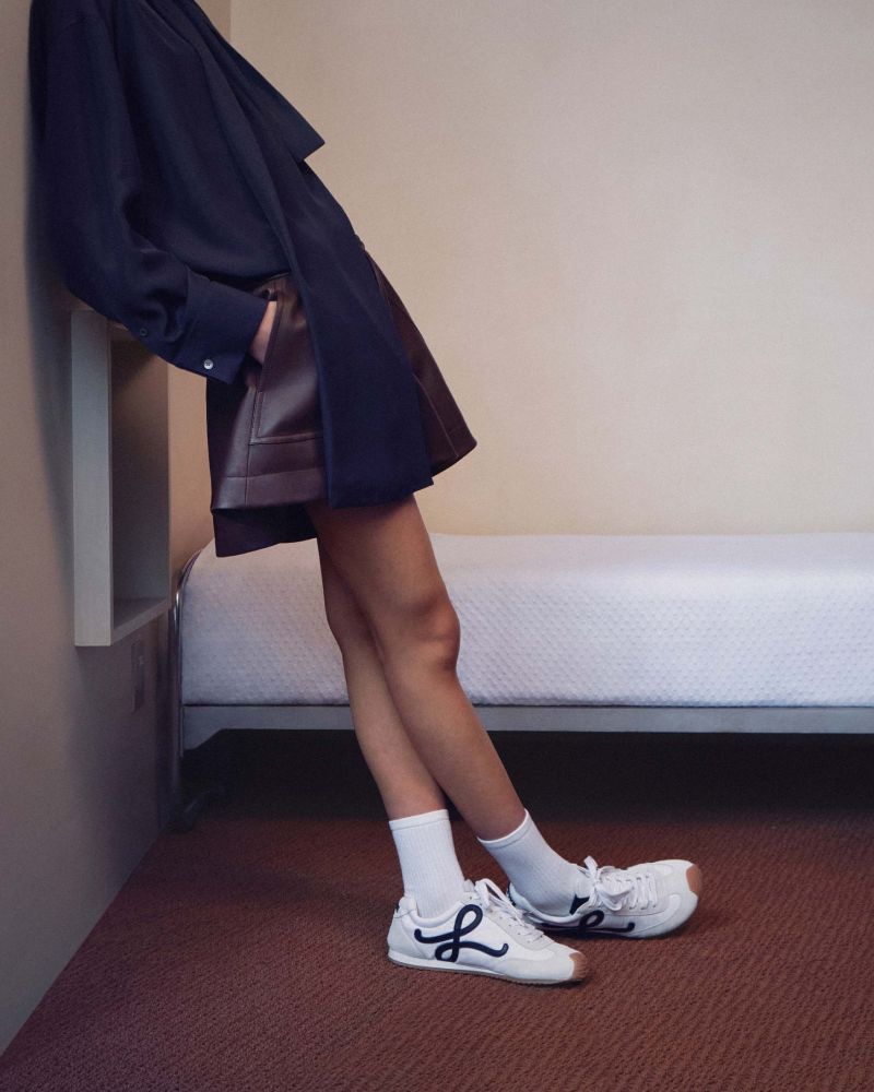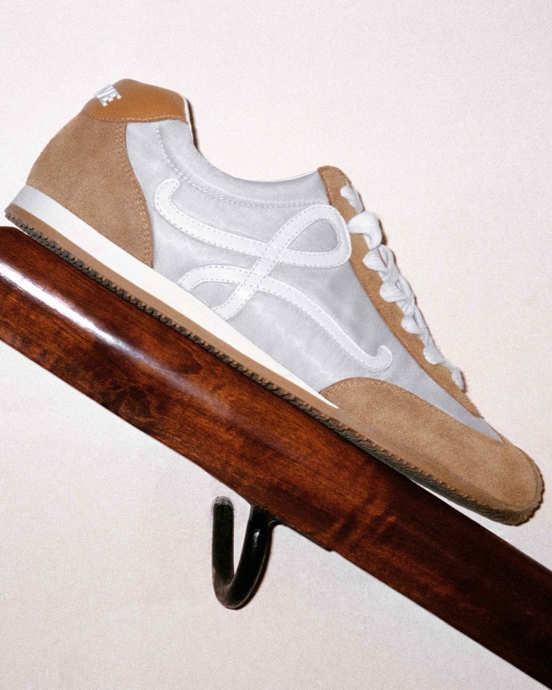 Loewe 的 Ballet Runner 2.0,在设计上混合了芭蕾舞鞋与阿甘鞋(跑鞋)的元素,是近年来 “运动×芭蕾风”(balletcore + 运动风)的来电组合。低帮设计加上偏细腻的不对称鞋头,让鞋型看起来既优雅又带点俏皮。