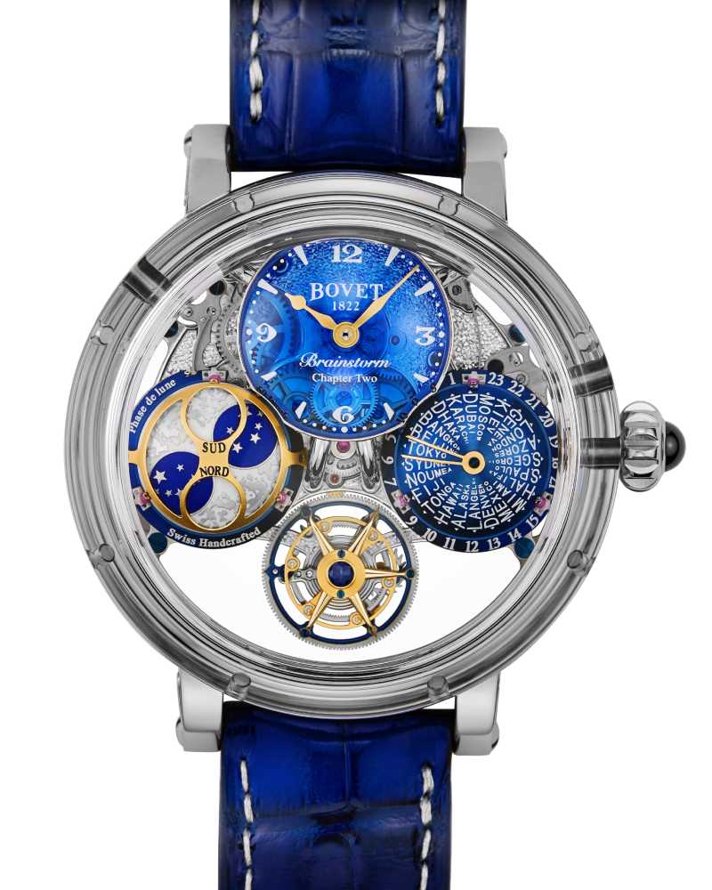 2020 年的机械创新奖得主 Récital 26,以全蓝宝石水晶表壳揭示内部奇景。半球形月相准确运转 127 年,配合世界时显示与飞行陀飞轮,BOVET 成功解决了曲面穹顶下的三维齿轮难题,展现少见的立体机械美学。
