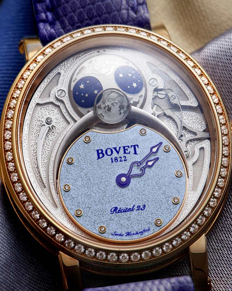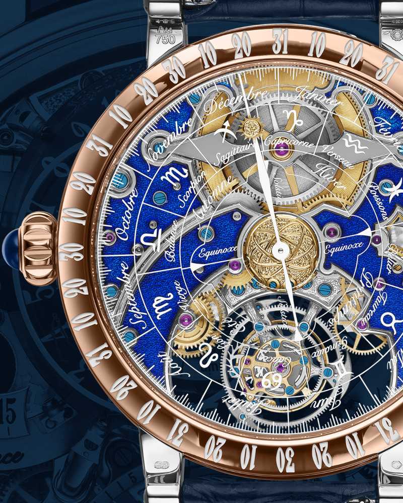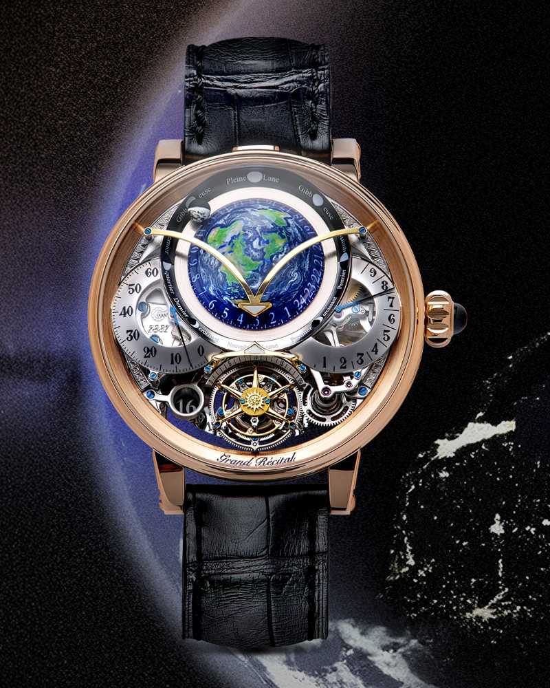 2018 年斩获 GPHG 金指针大奖的 Récital 22 Grand Récital,更是 BOVET 的巅峰之作。其机械行星仪(Tellurium Orrery)在表盘上展示地球、月球与太阳的相对运行:地球俯视旋转,月球绕行,陀飞轮代表太阳。配备万年历、逆跳分钟与九日动力储存,这枚腕表实现了天文与精准计时的完美共存。