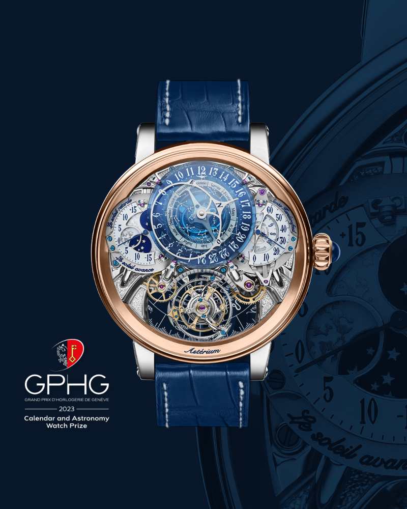 2023 年 GPHG 日历与天文奖得主 —— Récital 20 Astérium,则以机械之力重现星辰运转。穹顶星空盘显示 24 小时时间,并辅以时间等式、月相、逆跳分钟与双面飞行陀飞轮。翻转表背,更可见黄道十二宫、二分二至的精确历法,仿佛将整个宇宙凝缩于方寸之间。
