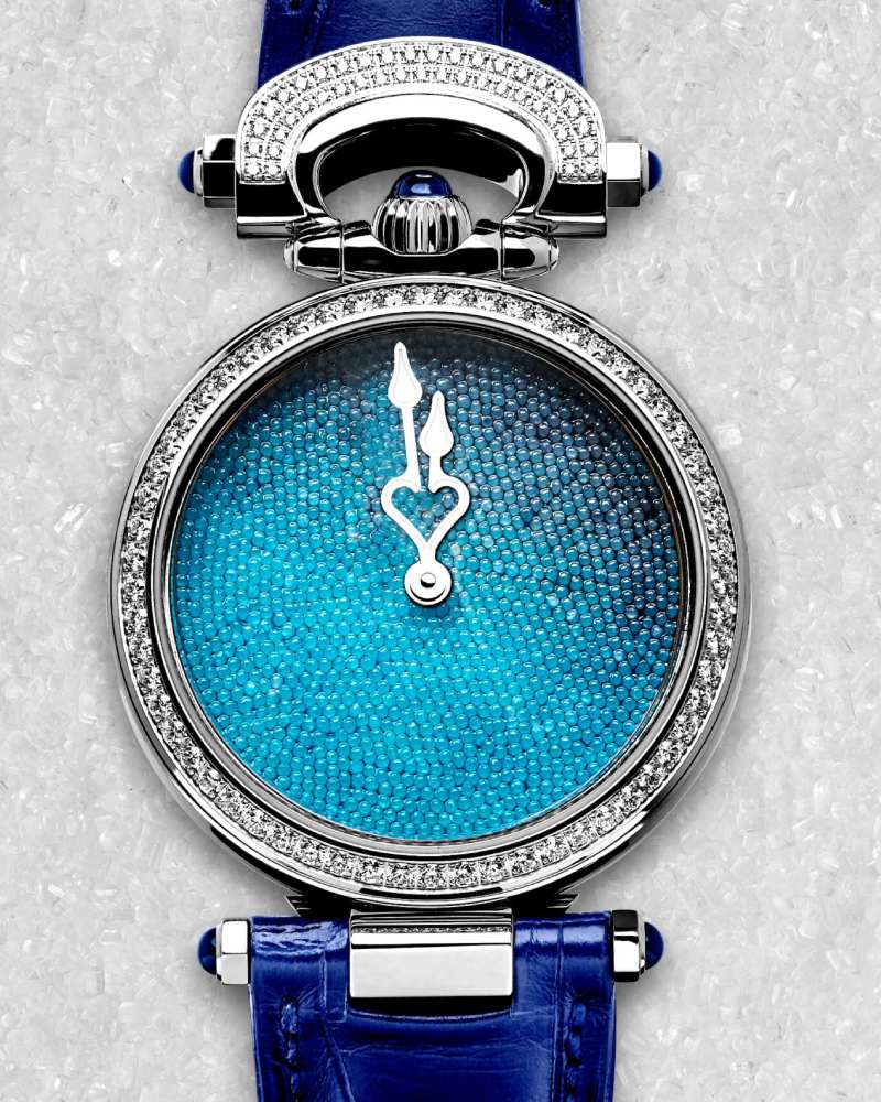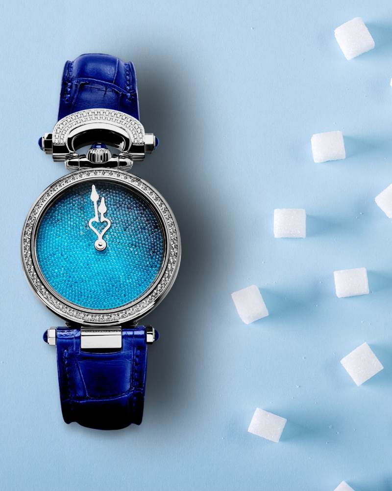 2021 年 GPHG 女士腕表入围作 Miss Audrey Sweet Art,首次以纯糖晶体打造表盘。甜美与纯净的意象,在糖晶体中凝结成独一无二的艺术质感,既是材料学的突破,也是微绘工艺的全新表达。