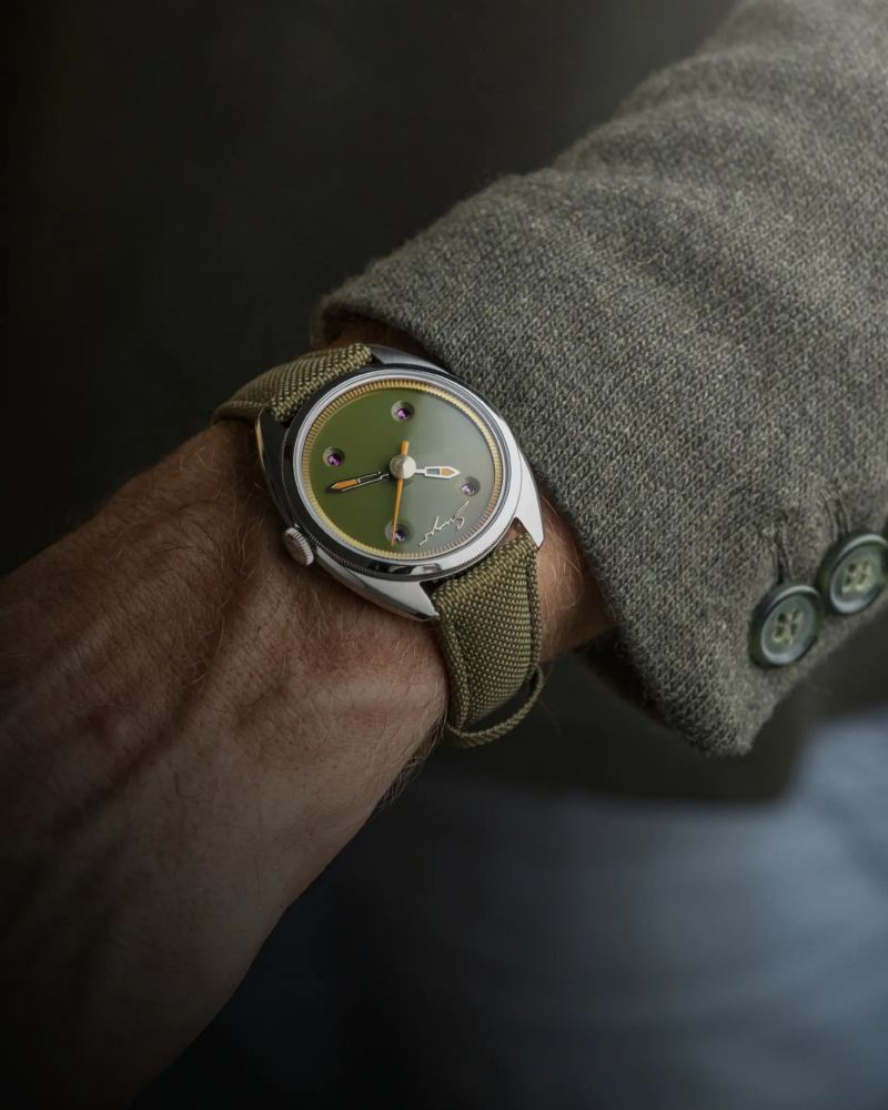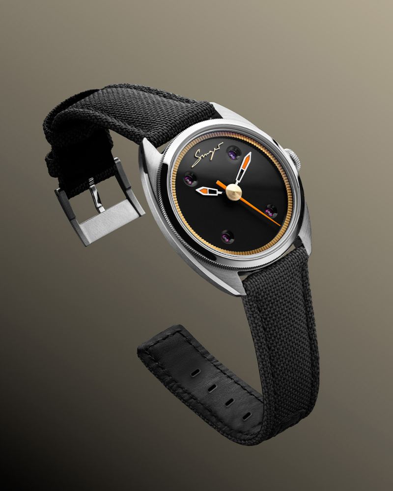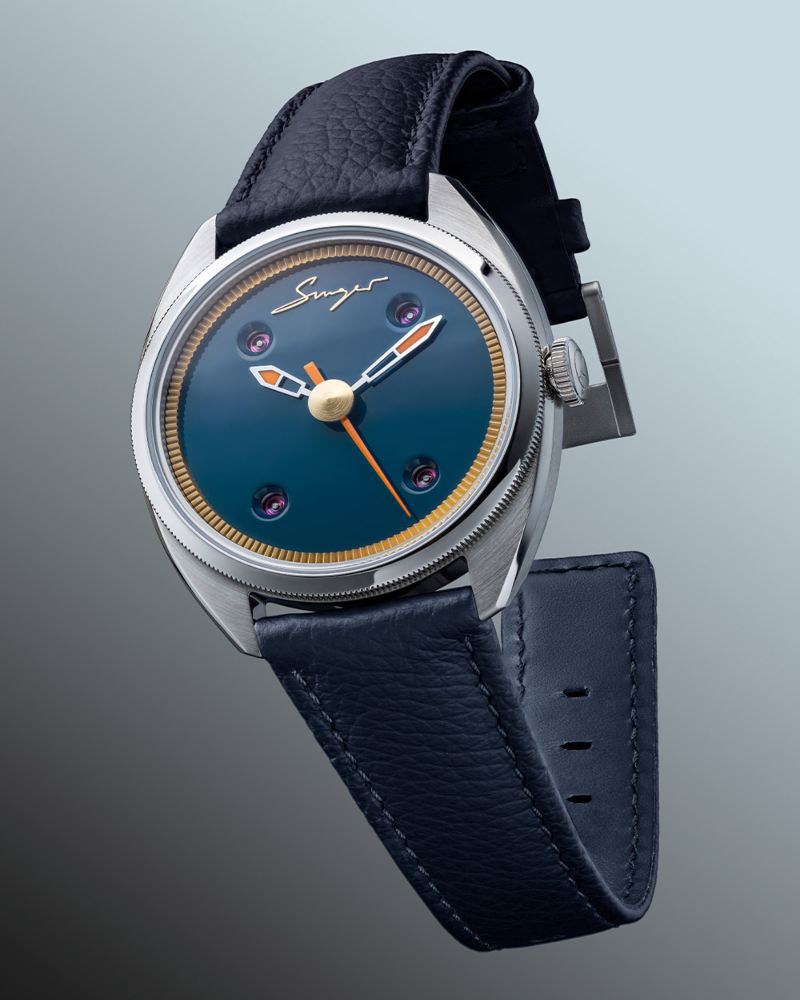 腕表的 39mm 不锈钢表壳纤薄优雅,三层式结构结合弧形蓝宝石水晶镜面与透明底盖,呈现出现代正装表的精致气息。表盘经过多层漆艺工序,提供帝国绿、石油蓝与钢琴黑三种选择,搭配金色齿状内圈与 Singer 标志性的橙色夜光细节,中央秒针点缀橙色与金色圆珠,赋予腕表鲜明辨识度。Caballero 的 “绅士气质” 不在浮夸张扬,而在尊严与自信的内在力量。