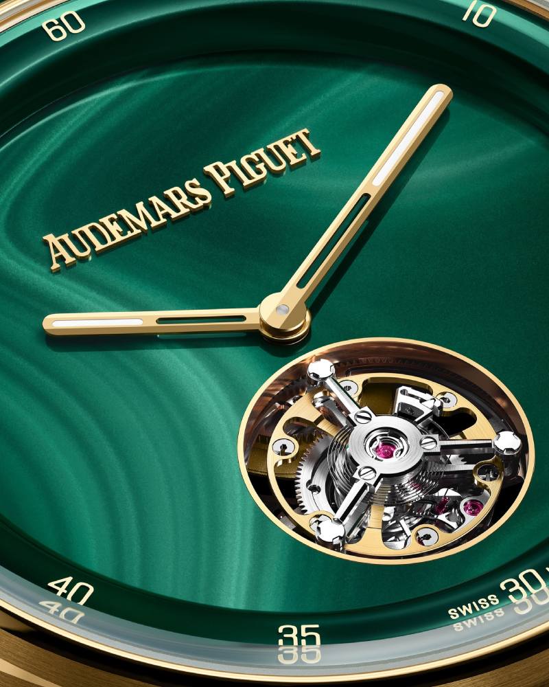 飞行陀飞轮仿佛悬浮在晶莹剔透的湖面之上,与 18K 白金、玫瑰金或黄金表壳交相辉映,营造出令人屏息的层次感。搭载仅 3.4mm 厚的 2968 自动机芯,这枚作品首次结合外缘传动与高摆幅擒纵系统,带来更高的稳定性与精准度。透过镂空设计,机芯的动态运转化为视觉艺术的展现,仿佛时间在指尖呼吸。Audemars Piguet 由女性微型表起步,如今再以纤巧比例结合陀飞轮复杂工艺,既延续历史探索精神,又以自然之美书写制表艺术的新篇章。