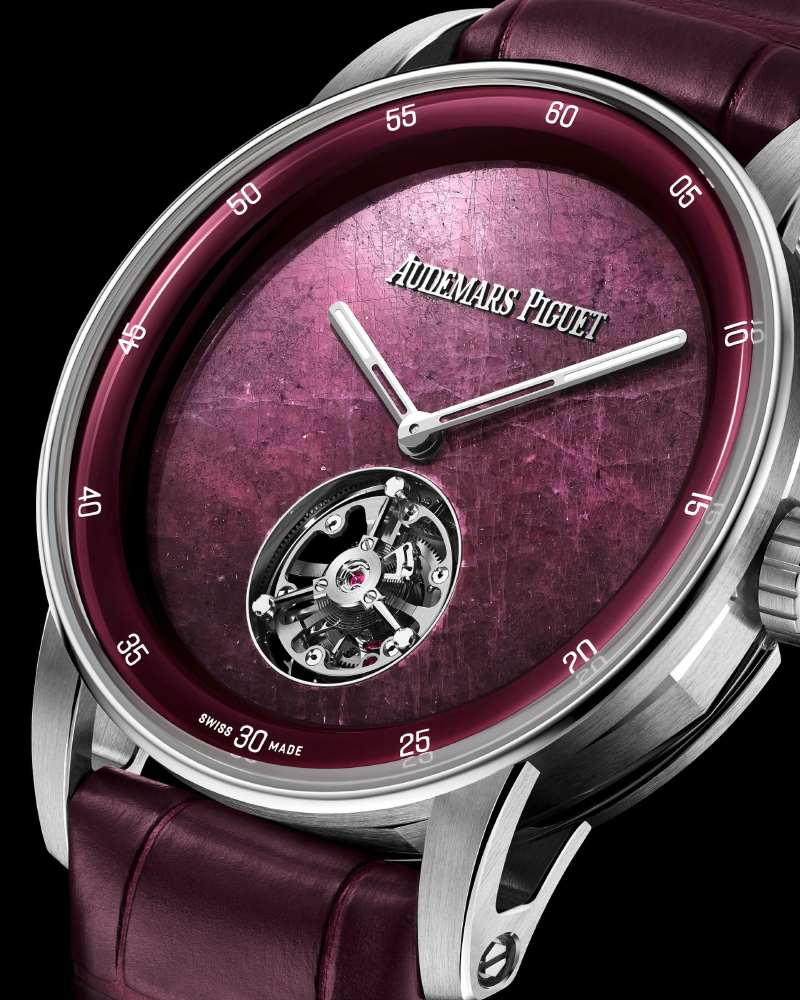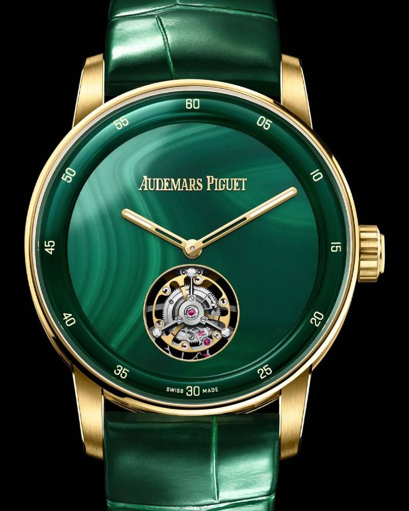 为庆祝 150 周年,爱彼在 CODE 11.59 系列中推出 38mm 飞行陀飞轮腕表,以天然宝石表盘诠释自然与机械的交融。新作分别采用坦桑尼亚红宝石根、巴西蓝色方钠石与尚比亚孔雀石,每一片宝石都经过匠人精雕细琢,保留原始质感的同时,呈现独特纹理与色泽。