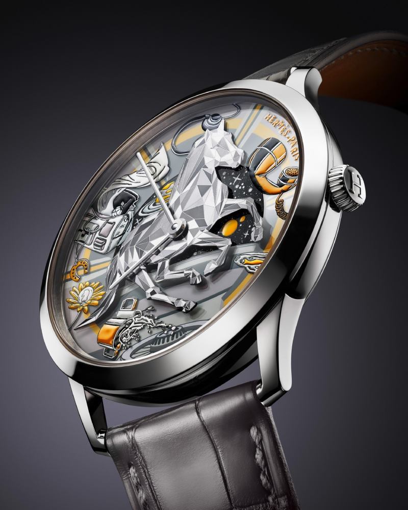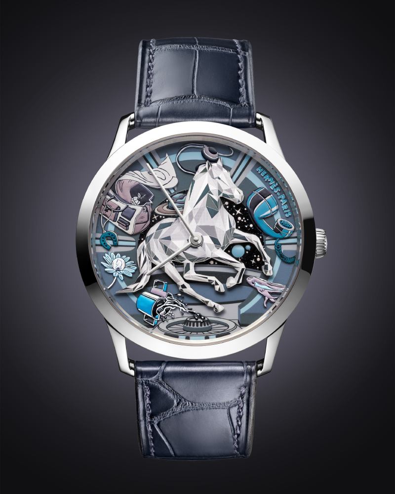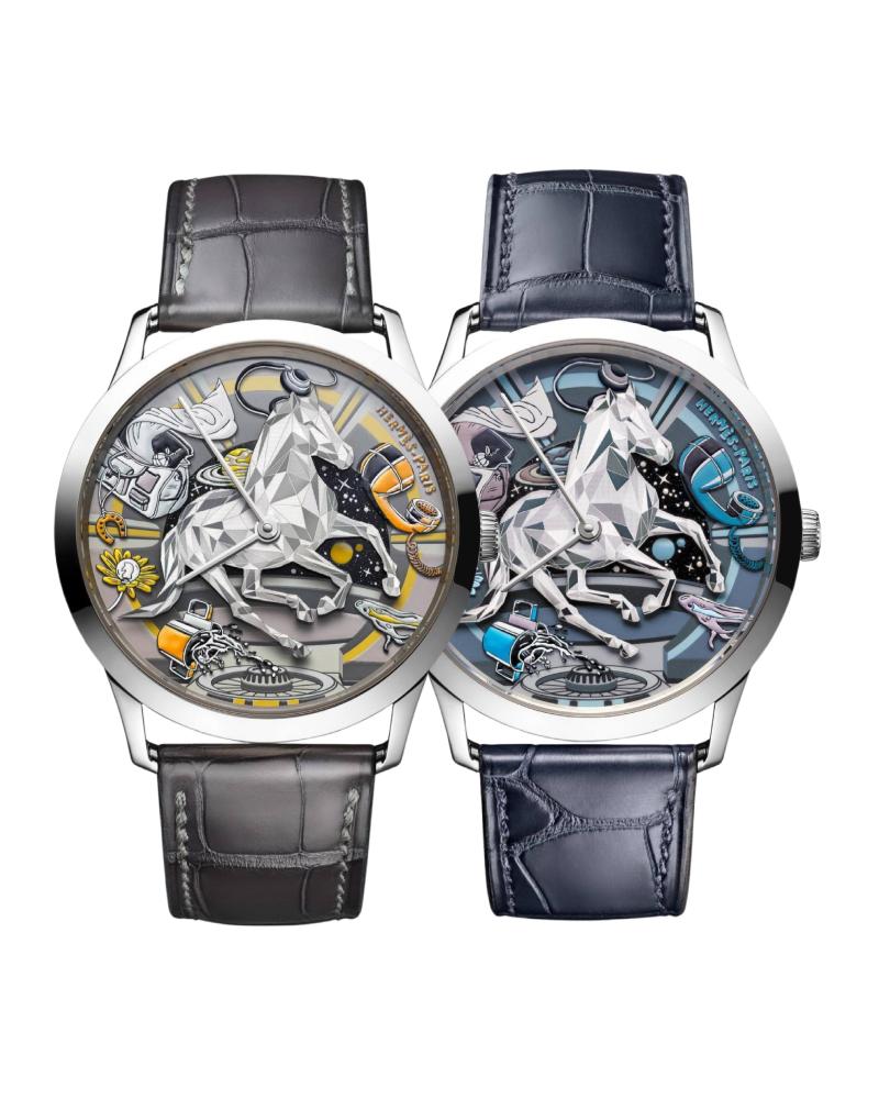 最耀眼的细节无疑是中央那匹银色骏马,工匠运用电化学蚀刻技术在金属板上刻画出细腻纹理,使其表面能够折射出如钻石切面的光影效果,仿佛骏马在宇宙中跃动。39.5mm 白金表壳纤薄优雅,配备石墨灰与深海蓝两条短吻鳄鱼皮表带,尽显 Hermès 在皮革工艺上的顶尖实力。这款全球限量 24 枚的作品,犹如一幅凝固的幻想画卷,将时间与梦境巧妙融合。