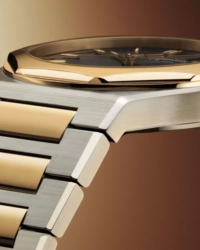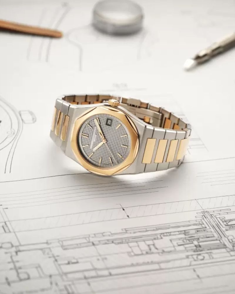1975 年诞生的 Laureato,是优雅运动腕表的先声。50 年后,GP 以纪念之名,再次将光影与金属的交错推至极致。新款以 39mm 精钢与 3N 黄金混合打造,一体成型的八角表圈经过缎面与镜面交错打磨,折射柔光与锋芒。深灰太阳纹表盘叠加经典「巴黎钉纹」,金色指针与刻度呼应双色主题,展现温润与力量并存的平衡。