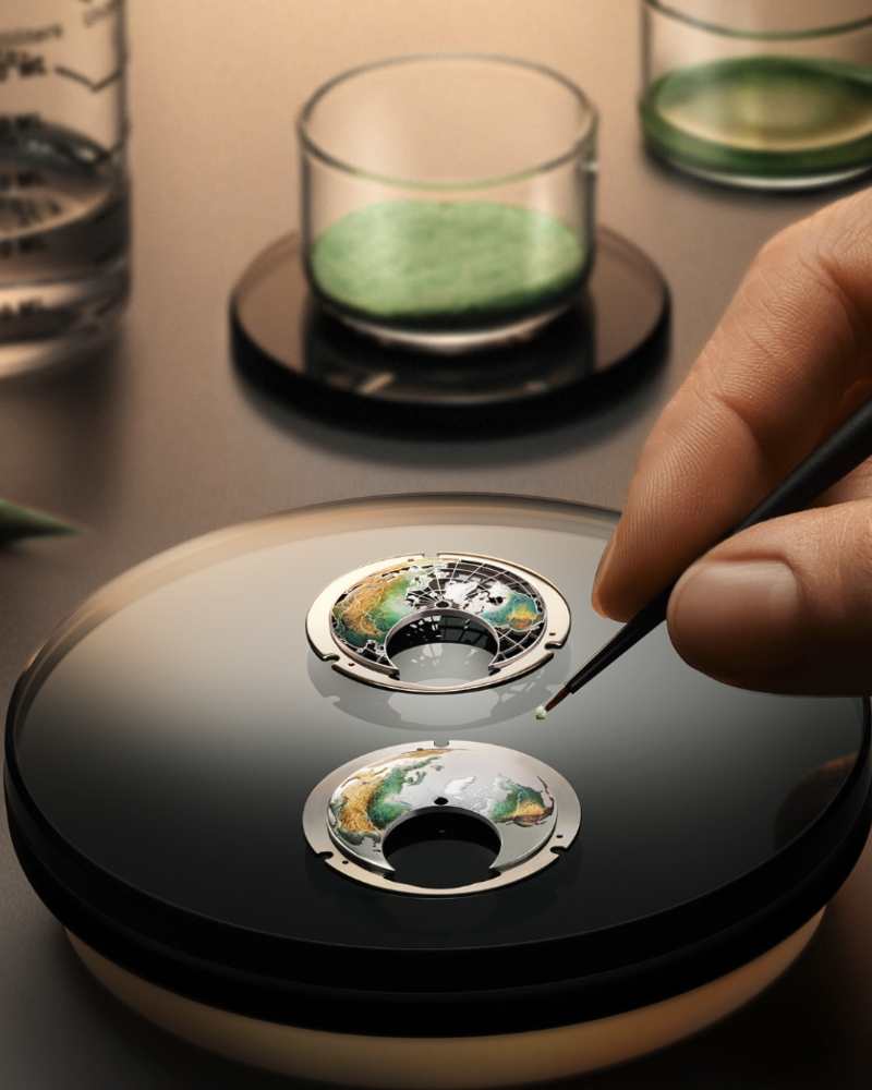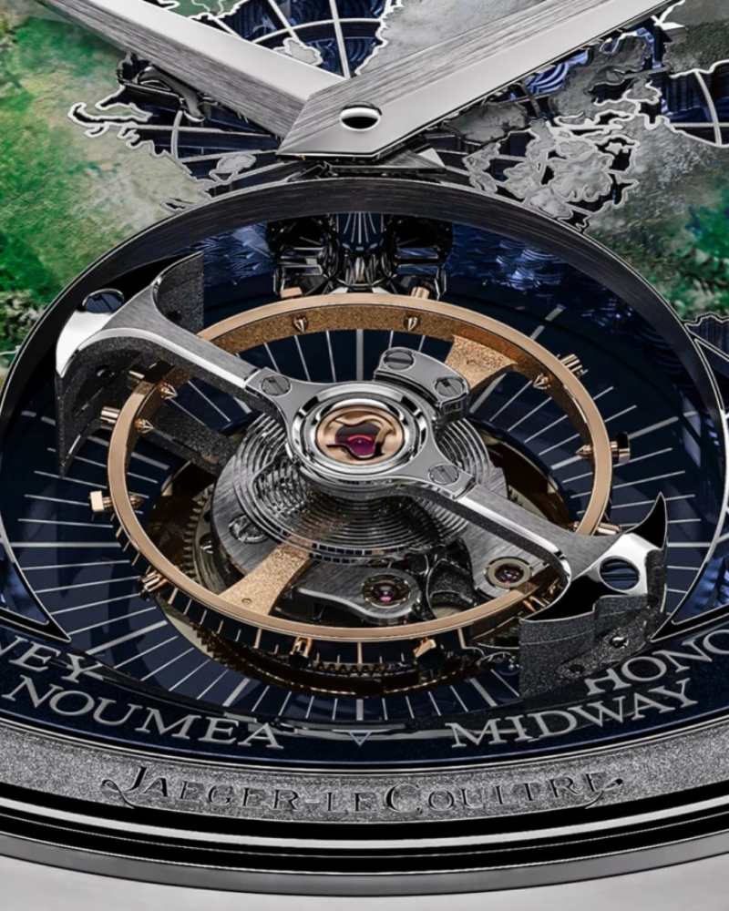 Jaeger-LeCoultre 将制表艺术提升至地理与宇宙的维度。全新 Master Grande Tradition Calibre 948 不只是显示时间,而是将 “世界时” 化为立体景观。18K 玫瑰金表壳包裹一幅以北极为中心的穹顶地图,大陆以内填珐琅工艺勾勒,海洋以手工扭索饰纹与多层半透明漆绘制,光影流动如潮汐。飞行陀飞轮悬浮海上,每 60 秒自转一圈,并在 24 小时内环绕表盘一周,象征地球自转。