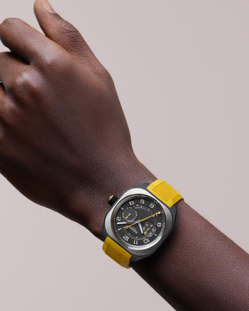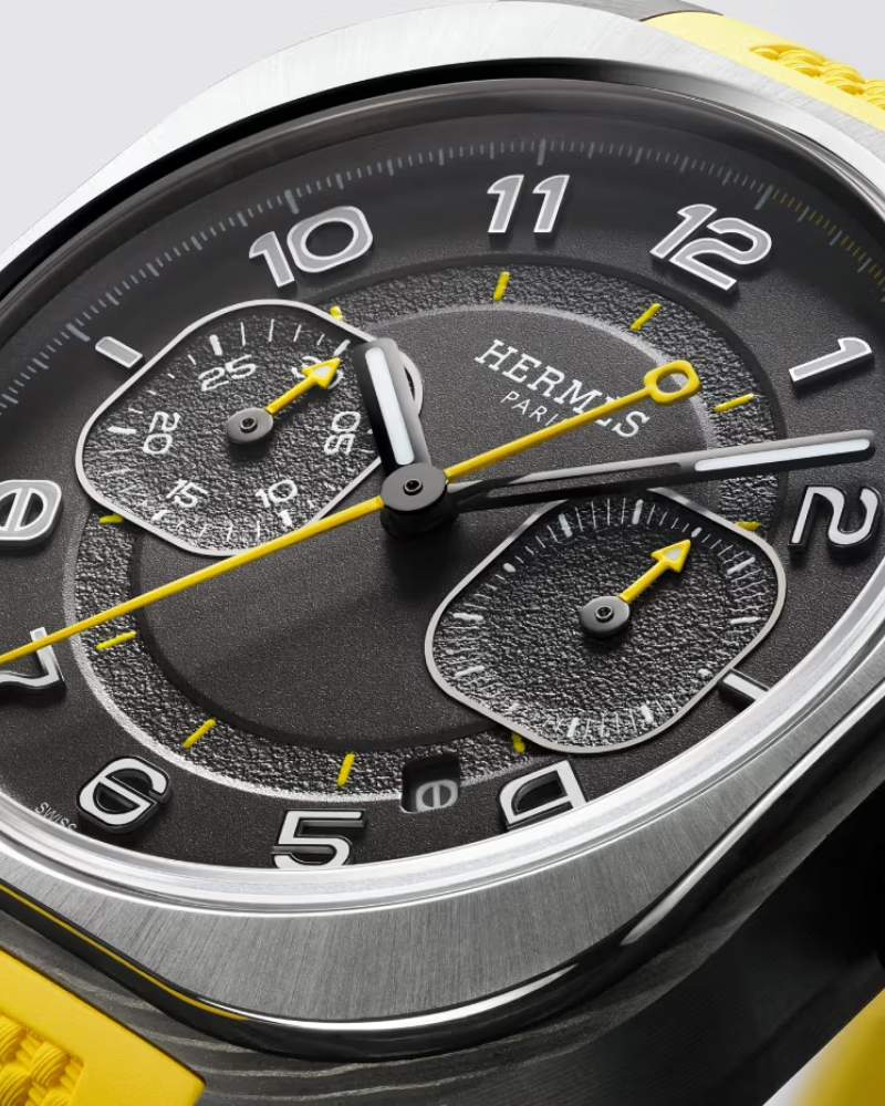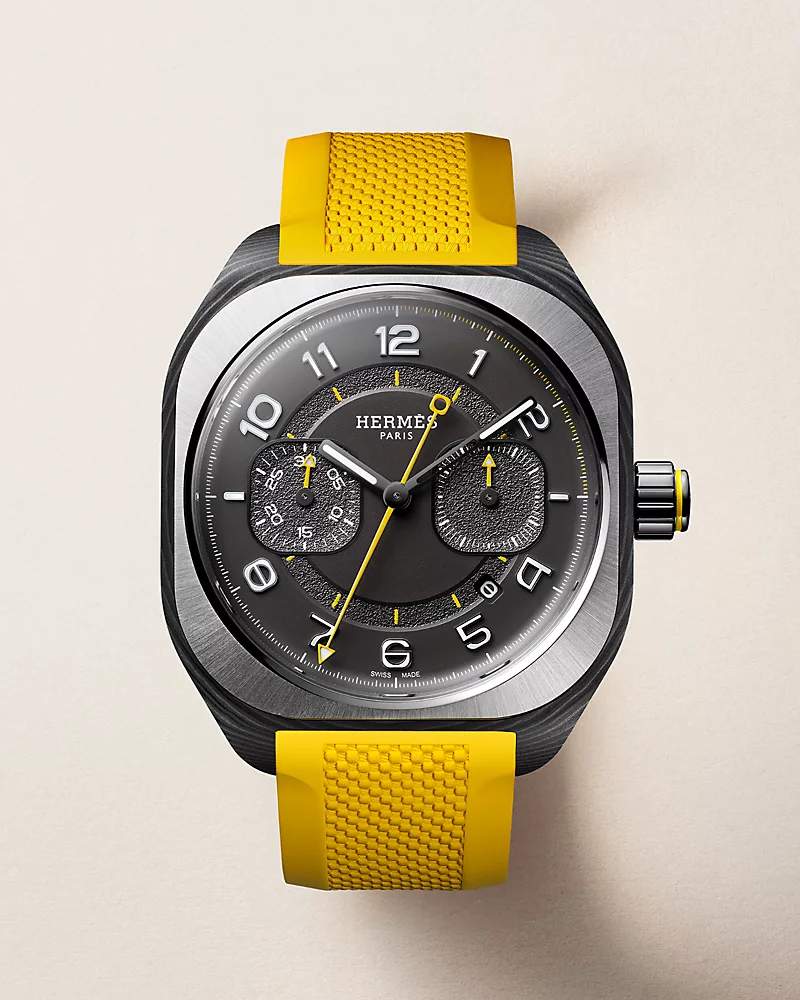 黑色表盘层次分明,双计时副盘与枕形日期窗布局清晰,黑金指针与夜光时标确保极佳可读性。内部搭载 Hermès 自制 H1837 自动机芯结合计时模组,精准而稳定。配以象征品牌精神的橙色橡胶表带,其纹理灵感取自爱马仕马具编织工艺 —— 让运动与都会气质在腕间交织。这不仅是一枚计时腕表,更是一种当代节奏的宣言:在方圆之间,掌握速度与优雅的尺度。