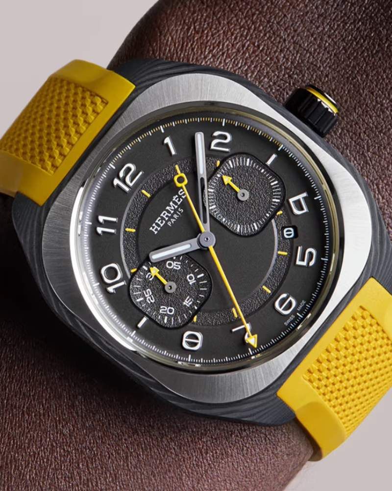 Hermès 再度以建筑般的美学语言,为现代男士书写时间的几何诗篇。由 Philippe Delhotal 掌舵设计的 H08 计时腕表,将圆形表盘与方形线条糅合于枕形结构之中,演绎出一种张力与平衡共生的美感。表壳以碳纤维与石墨烯复合材雕琢而成,既轻盈又坚韧;上方搭配缎面放射纹钛金属表圈,展现精致工业质感。黑色 PVD 表冠与橙色按把一体化设计,细节低调却极具识别度。