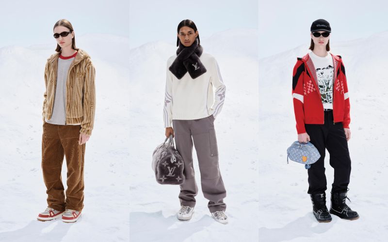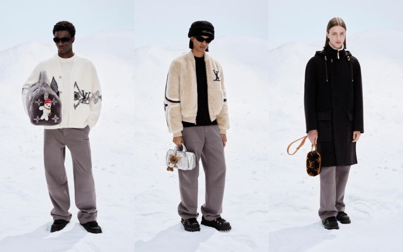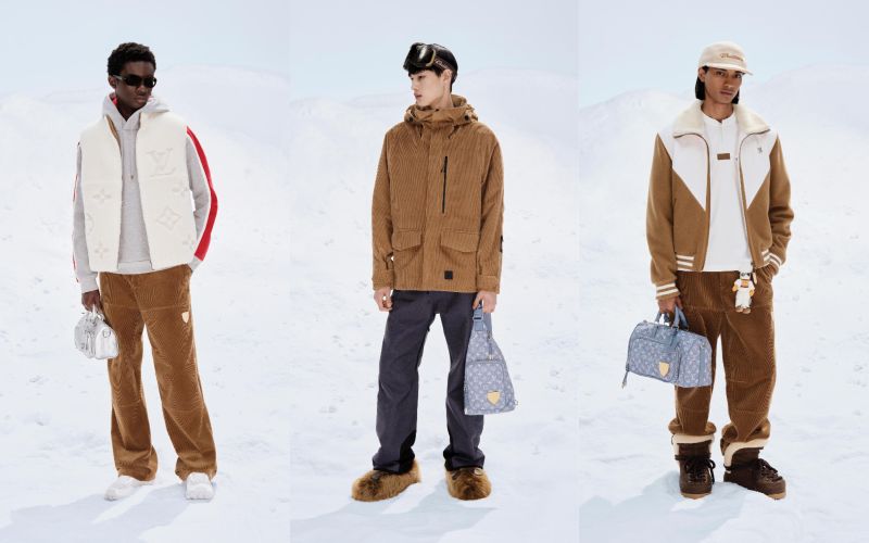 滑雪后时光同样精致:仿皮草外套、针织飞行夹克、羊绒混纺大衣与 Monogram 花卉针织,延续型男气度。配件从黑色刷毛毛帽到 LV Crush 毛圈纱毛帽与印花羊毛皮围巾层层推进;Yeti 雪靴以嵌花羊毛皮 Monogram 回归,LV Remix 登山靴与 LV Trainer Maxi 换上羊毛皮元素。