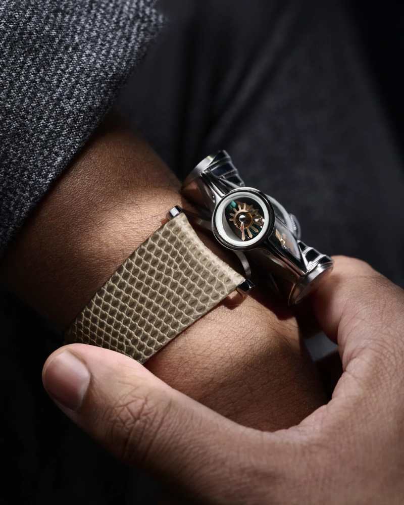 MB&F 向来善于把机械推向 “建筑化”。在 HM11 Art Deco 上,品牌把 30 年代的语法 —— 竖向棱线、阶梯结构、日光放射与双色装饰 —— 压缩为一座 “腕上立面”。42mm 的五级钛金属躯体之上,双层蓝宝石如天井采光,视觉焦点自然下沉;中央飞行陀飞轮宛如穹顶之心,四枚 “翼形模组” 向外伸展,分别承担时间指示、动力储备、机械温度计(摄氏/华氏)与时间校准的职责。