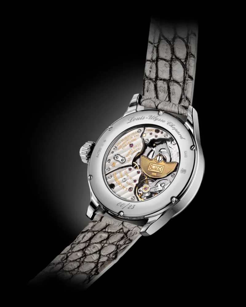 这枚作品的技术厚度,被写在时间轴上:自制 L.U.C 08.03-L 机芯的研发累计逾 11,000 小时,其中 2,500 小时仅用于打磨原型的微差;它同时获得日内瓦印记与 COSC 认证,在音色、工艺与走时标准之间寻找苛刻平衡。43mm 白金壳体内,开阔的立体视野让你一眼看见 “音乐如何诞生”:10 点位的双音锤抬起、落下,齿条、杠杆与凸轮在 0.03 秒内完成预备;6 点位的陀飞轮则作为精度的脉搏持续运转。侧面选择器可在大自鸣、小自鸣与静音一键切换。