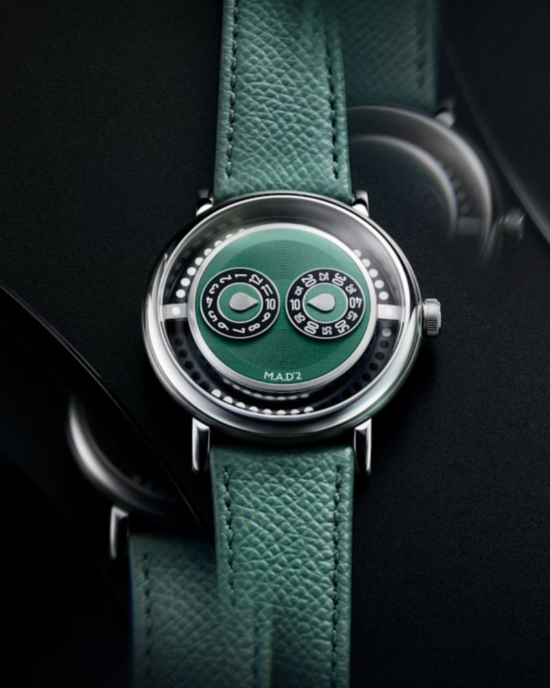 MB&F 的 M.A.D.2 延续品牌对机械艺术的玩味:作为 M.A.D.Editions 的作品,M.A.D.2 用 “唱盘/DJ 台” 式的中央立体盘面与旋转子表盘呈现时间显示,视觉上像一件可佩戴的机械雕塑;内部采用成熟的机芯(如 La Joux-Perret 基底改装)以保证日常可靠性。与 MB&F 的高端独立部件不同,M.A.D. 编辑系列更强调设计表达与相对可及的价格点,成为连接公众与独立制表创意的桥梁;K’ 编欣赏它以艺术性与可佩戴性兼顾的态度,还有的这也是 MB&F 售价最平民的表款。