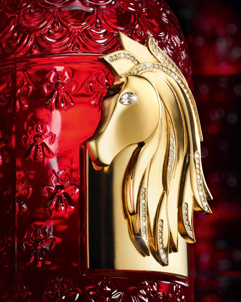瓶身正面镶嵌一枚以 24K 镀金打造的立体马首饰件,象征自由、能量与不断前行的力量。马首线条简洁而有张力,79 颗 Swarovski 水晶沿着鬃毛层叠镶嵌,其中一颗杏仁切割水晶点亮马眼,令整体更显灵动神采。这件珠宝级装饰由 Atelier Truscelli 纯手工完成,凝聚其创始人 Francesco Truscelli 对 “情感工艺” 的坚持 —— 让物件超越美感本身,成为承载记忆与情感的存在。