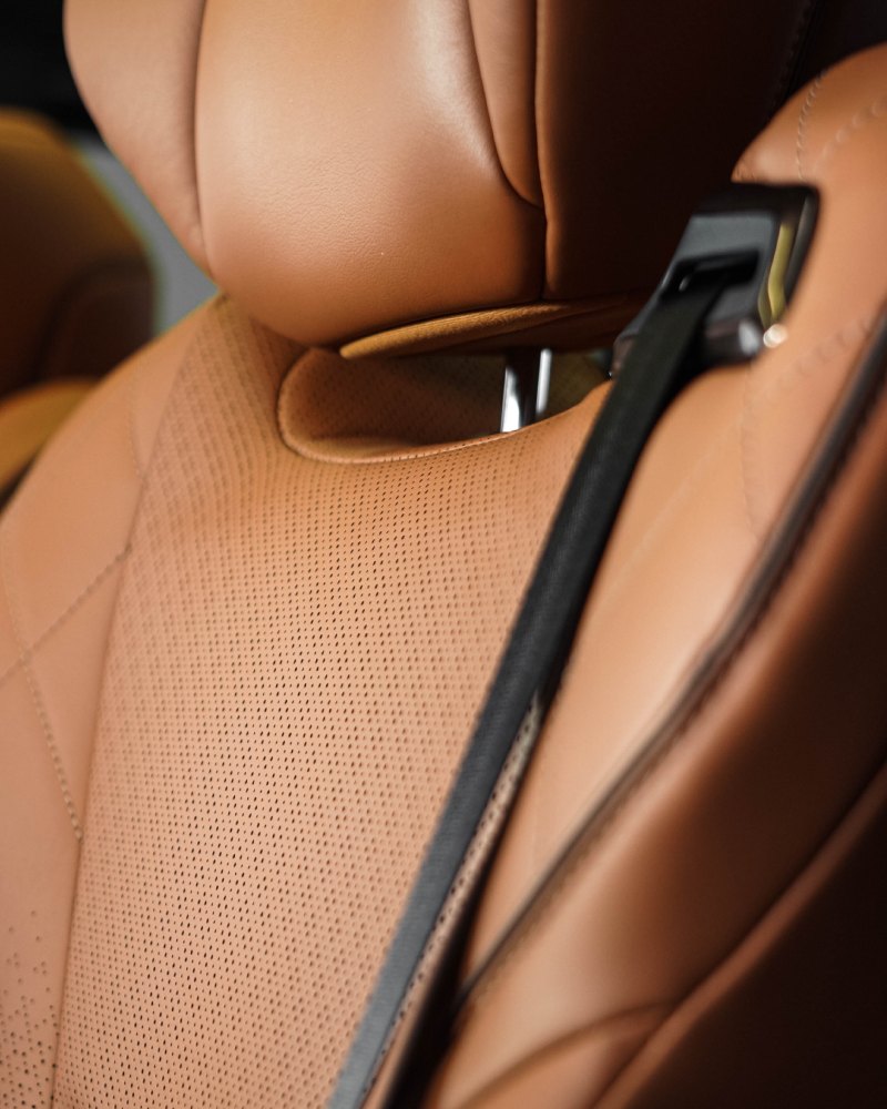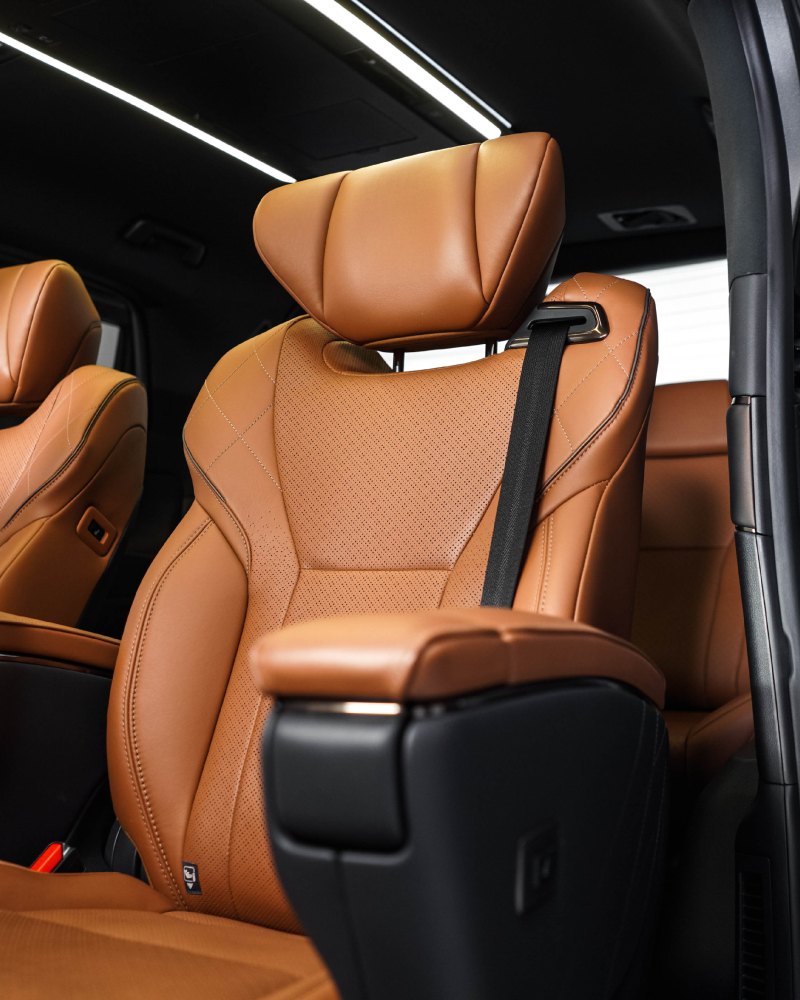 车厢内大量采用 Nappa 真皮与柔触材质,并配置 64 色可调式氛围顶灯,辅以旗舰专属 Sunset Brown 内饰主题,展现沉稳而现代的奢华气质。15 扬声器 JBL 音响系统、14 吋后座吸顶屏幕,以及可通过手机应用操作的远程启动与车联网系统,使科技体验自然融入每一段旅程。
