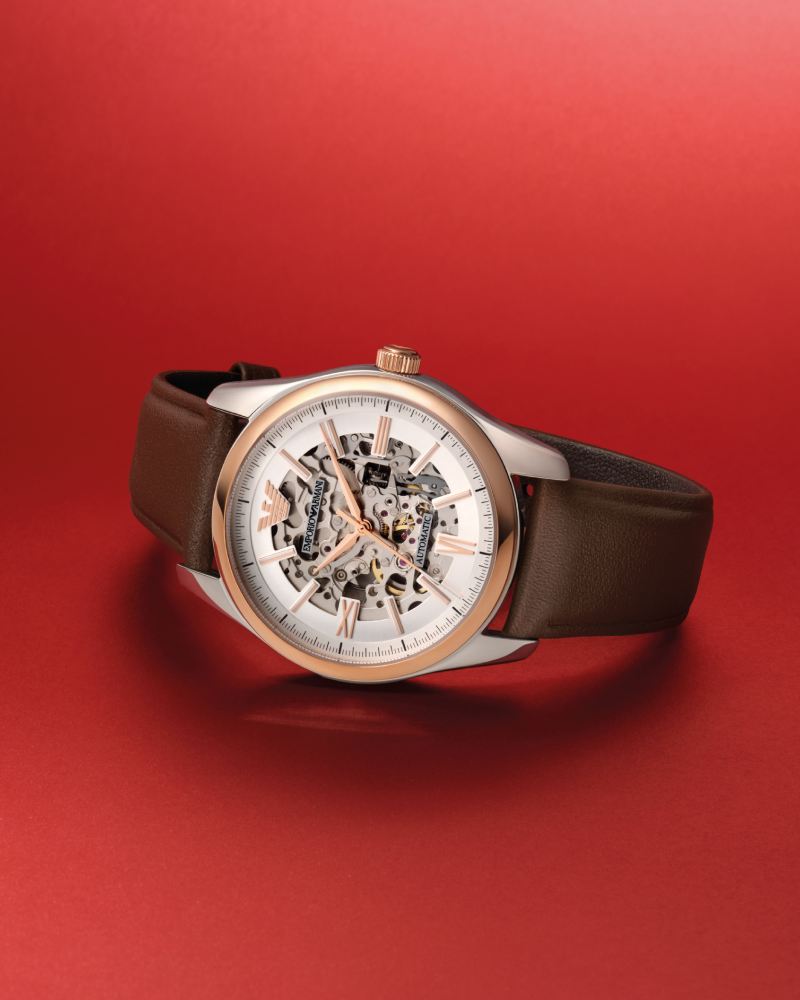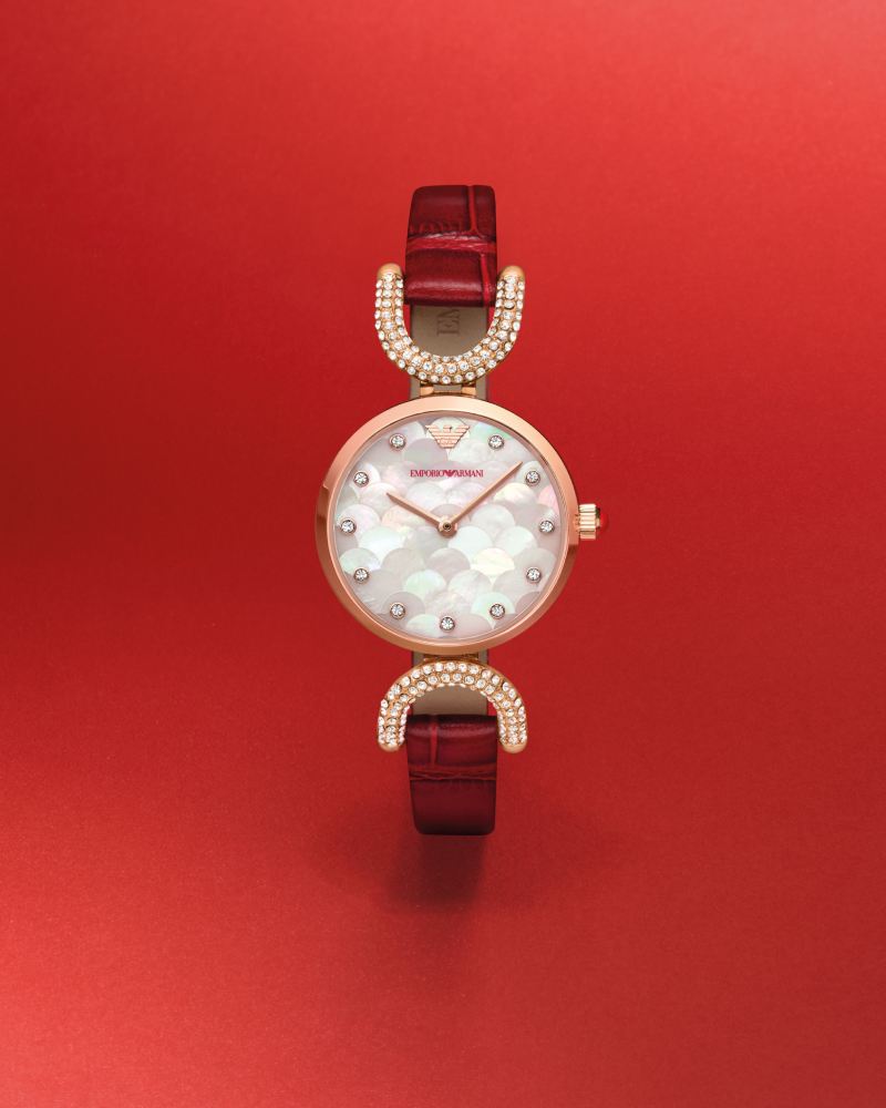 男士自动机械腕表以镂空表盘展现律动美感,女士腕表则以珍珠母贝表盘、钻饰马蹄与酒红鳄纹表带勾勒新春华彩。以马为名,向新年进发 —— Emporio Armani 邀你共赴 2026 的时尚新章程。