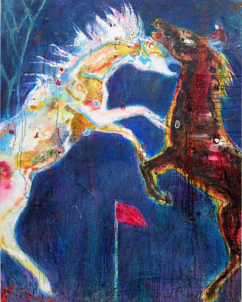 德国当代艺术家 Daniel Richter 的《White Horse – Pink Flag》,将观者拉入一种介于现实与幻象之间的场域。霓虹般的白马与红褐色战马在画面中对峙,能量在瞬间被推至极限,既美得炫目,又暗藏不安。