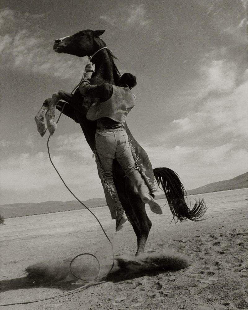 摄影大师 Ernst Haas 于 1960 年在电影《乱点鸳鸯谱》内华达片场拍下《跃马》。画面中,克拉克·盖博的替身与烈马同时腾空,野性西部的自由精神在此被永久封存。