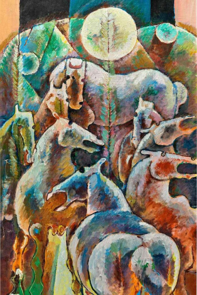 中国艺术家石虎的《八骏马》,以粗犷而奔放的笔触,将西方现代艺术语汇与中国水墨传统融为一体。色彩在纸面上翻涌,马的力量不再只是形象,而是一种几近原始的精神释放。