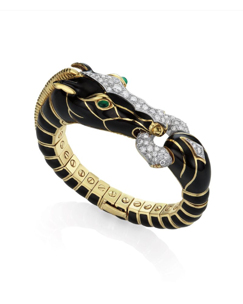 自 1948 年起,David Webb 以大胆用色与立体造型定义美式高级珠宝。这件马形手镯以18K黄金与铂金打造,钻石密镶的马首、黑色珐琅的躯体与祖母绿双眸相互辉映,赋予静态珠宝以几近呼吸般的生命张力。