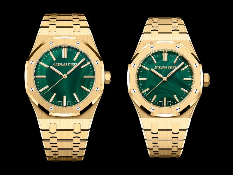 该款还采用了行业标杆级别的陶瓷表链;陶瓷使腕表轻盈但保持价值感,且表链的缎面处理极为出色。另有两款黃金材质的三針 Royal Oak(41 或 37mm),搭配孔雀石(malachite)石材表盘,黃金與深綠的组合一如既往受藏家欢迎。