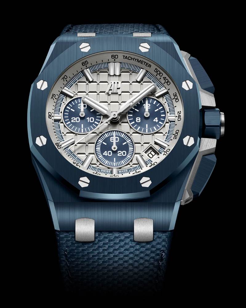 展现 Gerald Genta 设计平衡性的还有数款变体:其中一款为深邃午夜藍陶瓷材质的万年历(Ref. 26674CD.OO.1225CD.01),色彩为 AP 所称的 “Bleu Nuit, Nuage 50”(延续 150 周年色系),其深邃度与优雅别具一格。