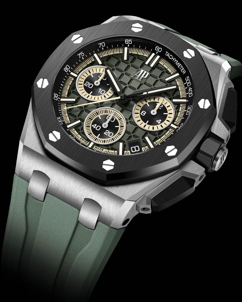 Offshore 系列以其大氣與霸氣著稱,2026 年新增兩款計時碼表與三款 Diver 變體。系列中有採用 “Bleu Nuit, Nuage 50” 深藍陶瓷 43mm 表殼,搭配米色 Méga Tapisserie 表盤與鈦金屬細節,呈現經典且永恆的海事風格;另一款計時則走更具侵略性的路線(鈦殼、黑色陶瓷表圈、漸變綠色 Méga Tapisserie 表盤)。