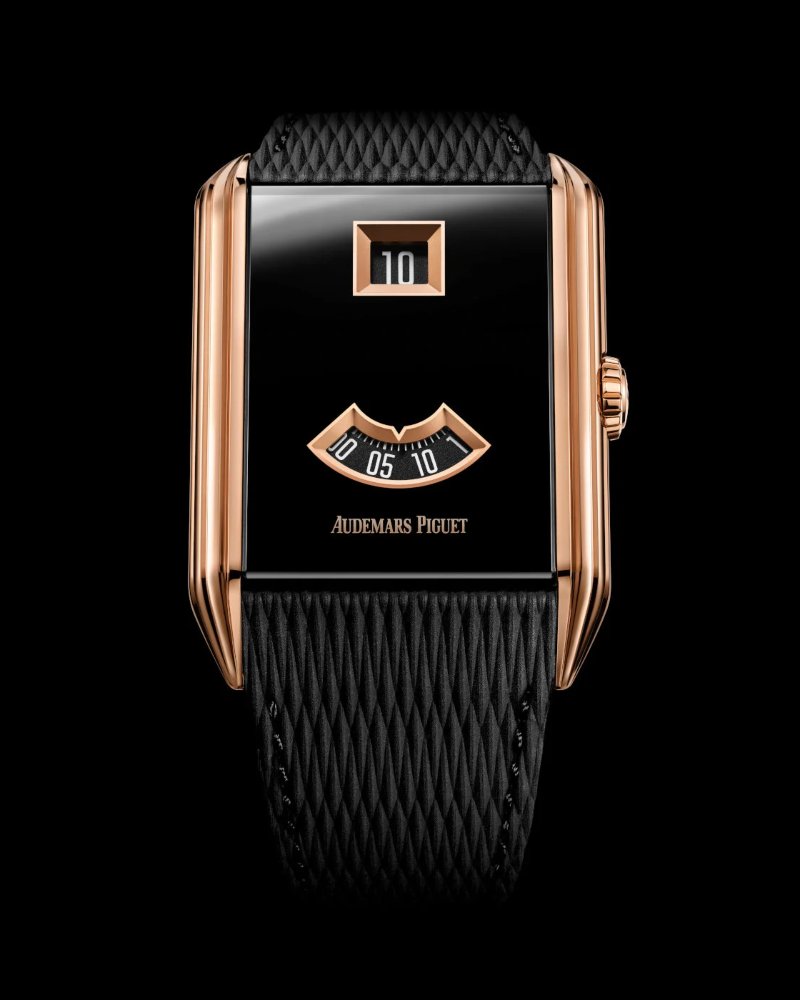 它搭载 calibre 7122 —— 品牌首见的自动上链跳时机芯,其设计基础来自 Royal Oak ‘Jumbo’ 使用的自动机芯 calibre 7121。外观上,“Neo Frame Jumping Hour” 灵感源自 1929 年的 1271 型号:34mm(厚 8.8mm)的矩形表壳,具装饰性的装饰阶梯侧面,材质为玫瑰金,表带与表面为黑色,表盘(或者更准确地说,是表壳顶面)采用 PVD 处理的蓝宝石水晶制成。总体风格既有古典韵味又具当代感,是本次 22 款新品中最令人意外的一枚。