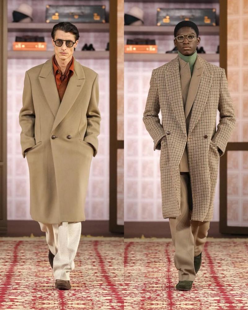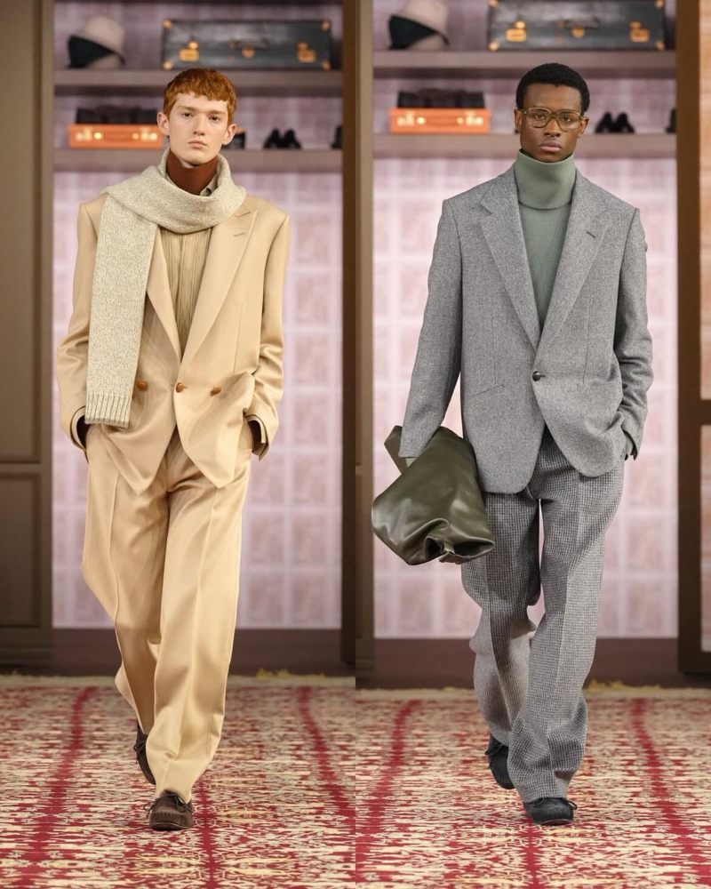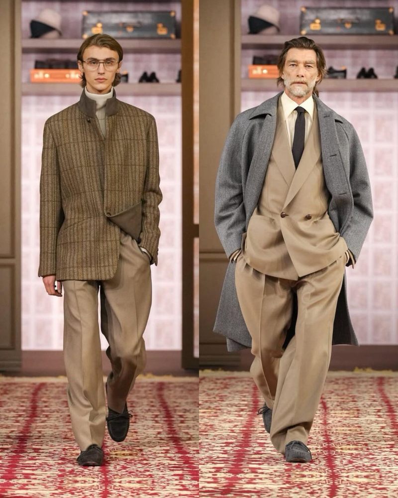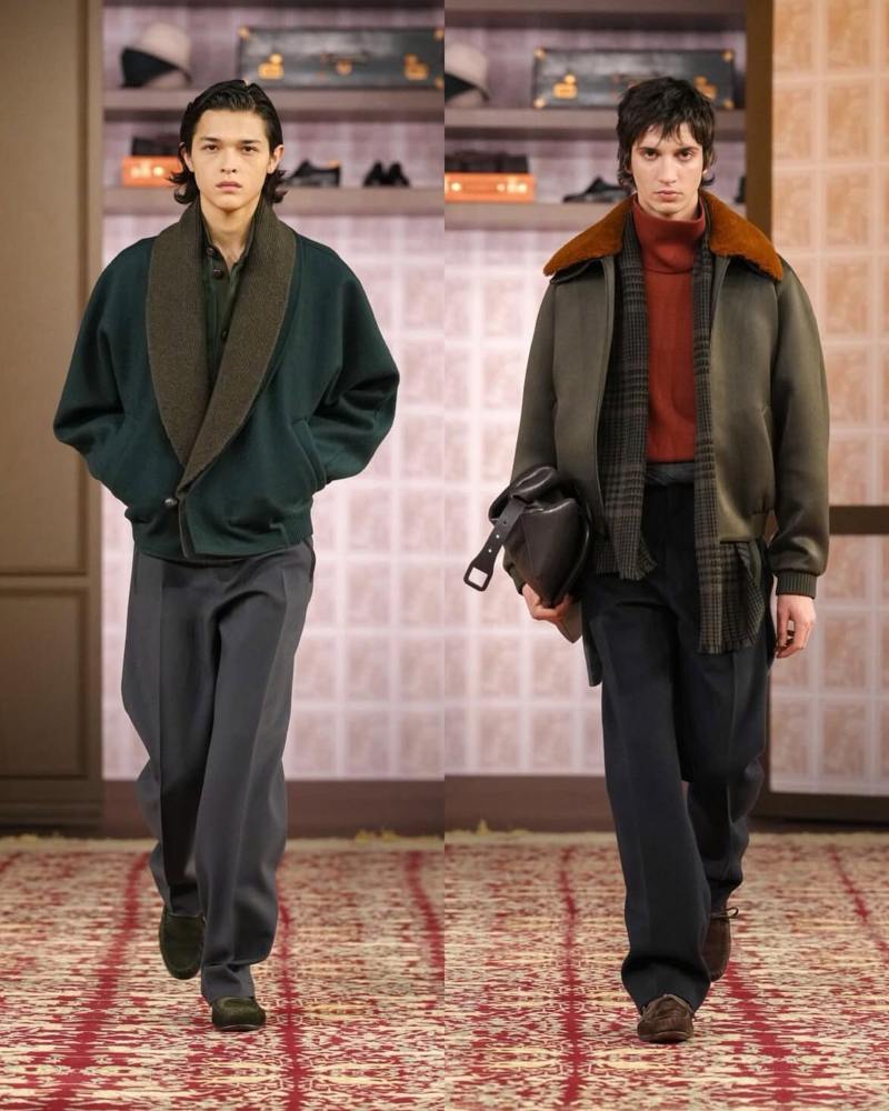 由创意总监 Alessandro Sartori 掌舵的 Zegna,则继续在经典与现代之间寻找平衡。本季秀场聚焦于正式着装的革新:剪裁利落的西装搭配质感上乘的大衣,构建出兼具力量与优雅的当代绅士形象。