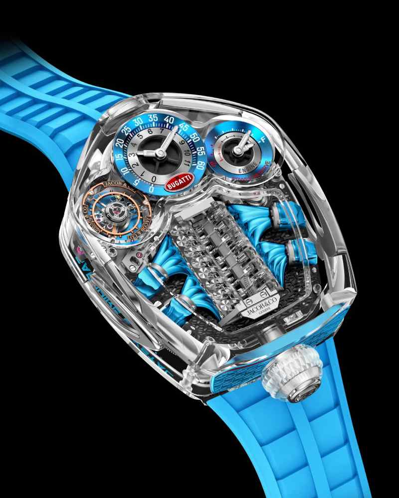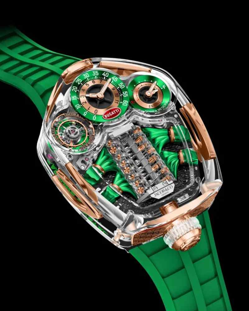Jacob & Co. 的 Bugatti Tourbillon Sapphire Crystal 则将奢华与机械戏剧性推向极致。整块蓝宝石表壳宛如透明展柜,将 V16 发动机缸体自动装置与飞行陀飞轮毫无保留地展示出来。它不只是腕表,更像一件可穿戴的超级机hER械雕塑。