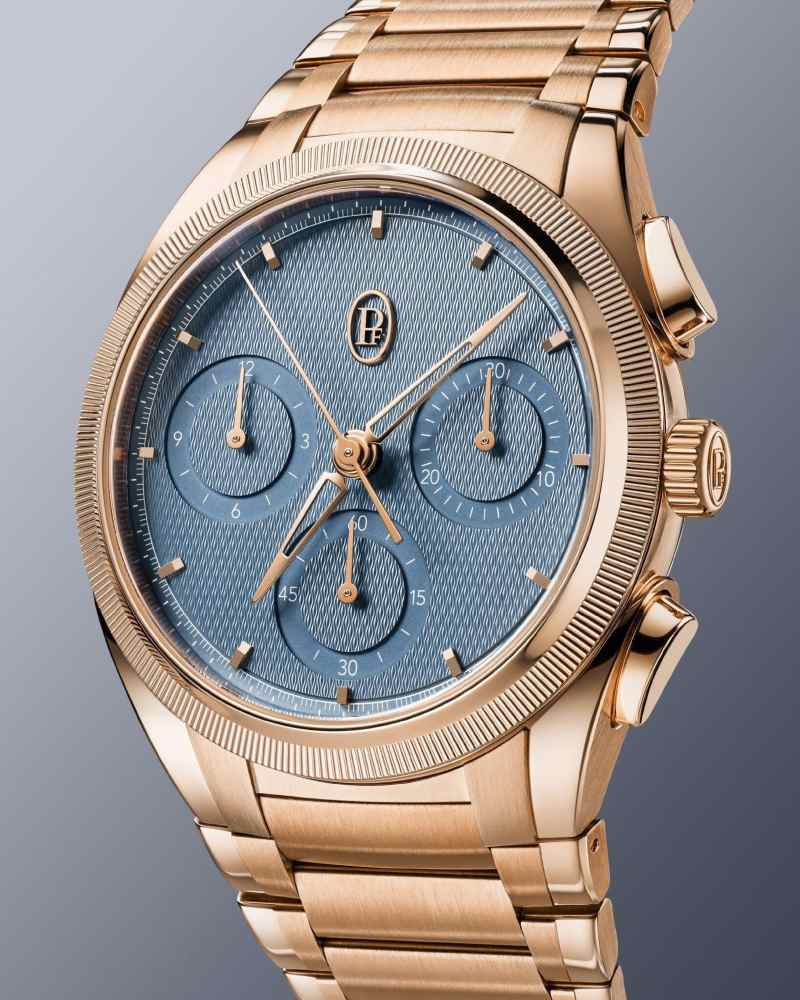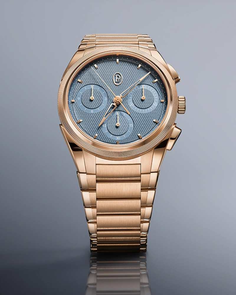 Parmigiani Fleurier 推出的 TONDA PF Chronograph 40mm,则是精致与力量并置的代表。18K 玫瑰金搭配矿物蓝表盘,让计时功能呈现出一种温暖而优雅的节奏感。取消日期后,盘面更加纯净,比例也因此更显从容。